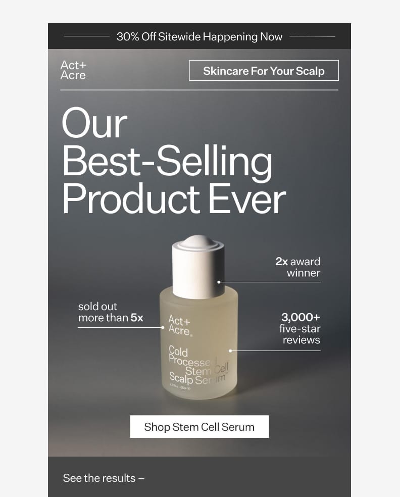 Act+Acre’s email proves you don’t need flash to drive conversions. With a minimal layout, strong visuals, and just enough proof points, this campaign makes its best-selling serum the undeniable hero.