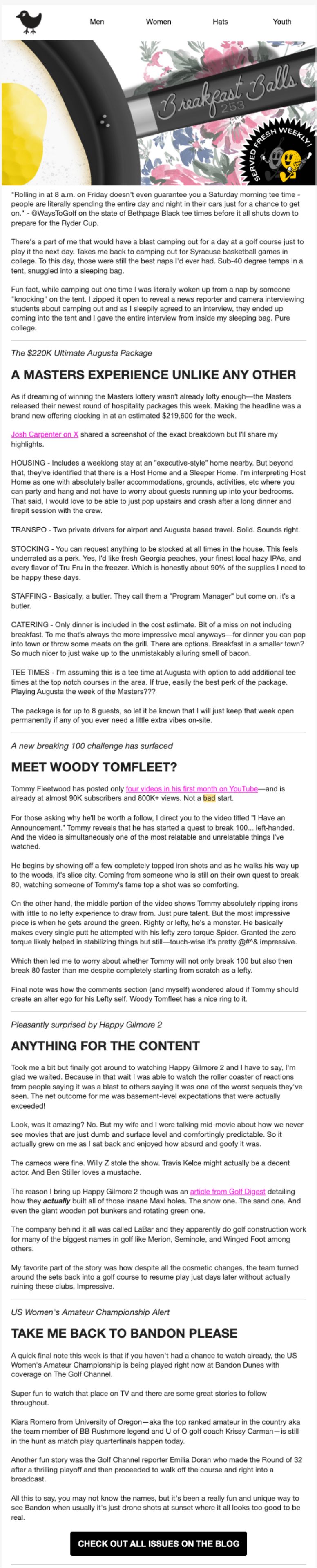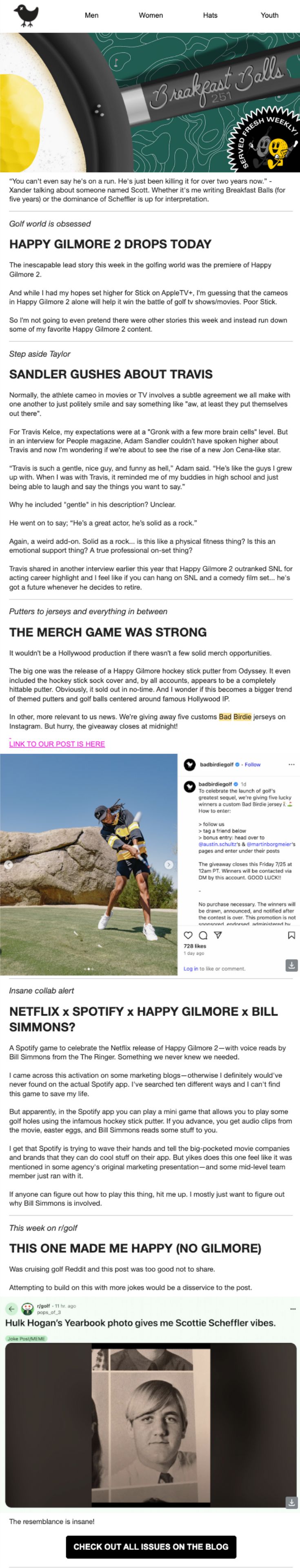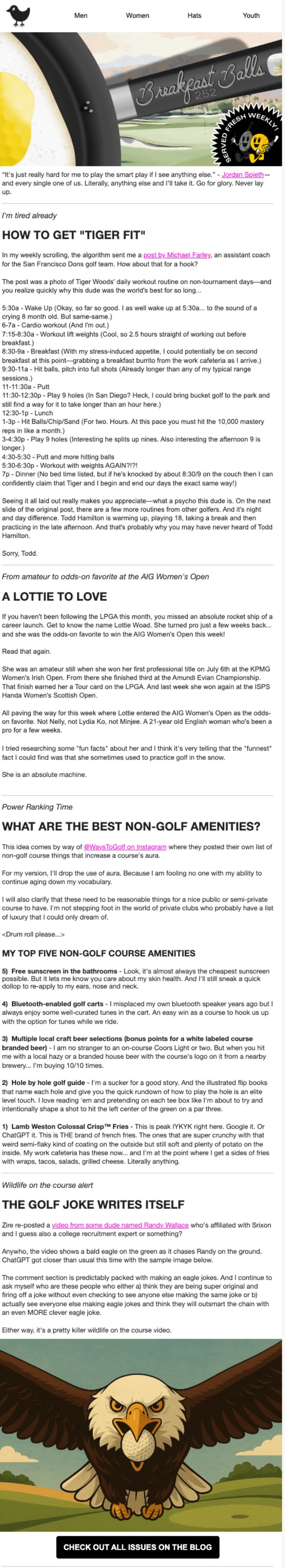 Bad Birdie’s Breakfast Balls isn’t about constant product pushes, it’s golf culture, pop culture, and clubhouse humor that keeps readers hooked. From ranking the best golf souvenirs to joking about “Tiger Fit” workouts, they’ve built a golf-obsessed community without selling in every send.