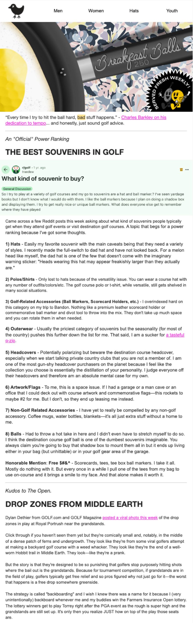 🌍 Cross-Channel Connection: The newsletter pulls in Instagram content, Reddit threads, and golf world gossip, making the community feel bigger than just the inbox.