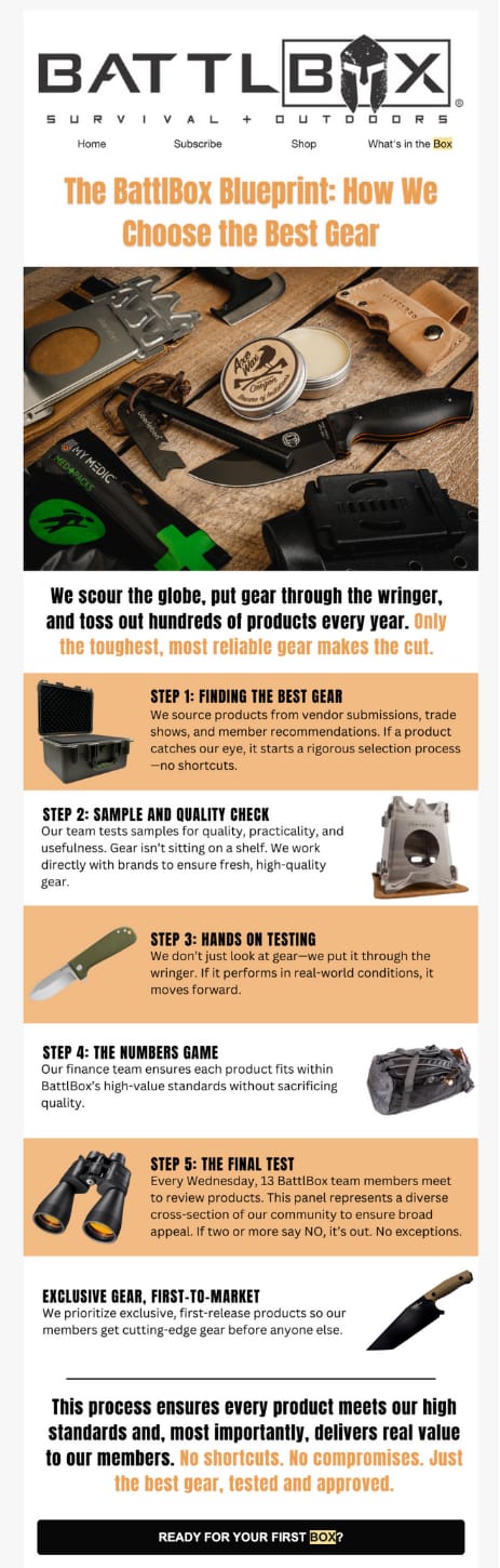 When you buy from a brand like Battlbox, you expect an experience that matches their rugged, adventure-driven identity. The email sequence that follows your purchase should feel like an extension of that journey—fueling excitement, reinforcing the brand’s voice, and maybe even nudging you toward that next order.