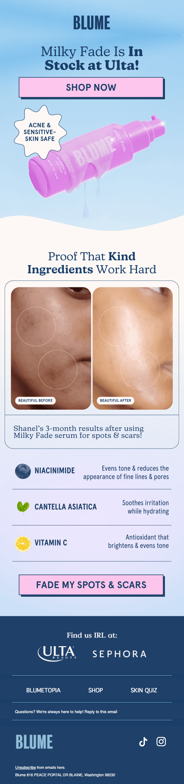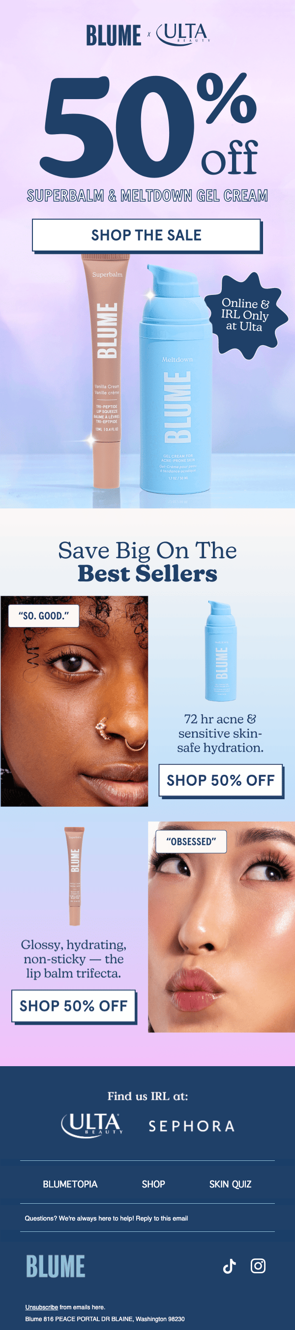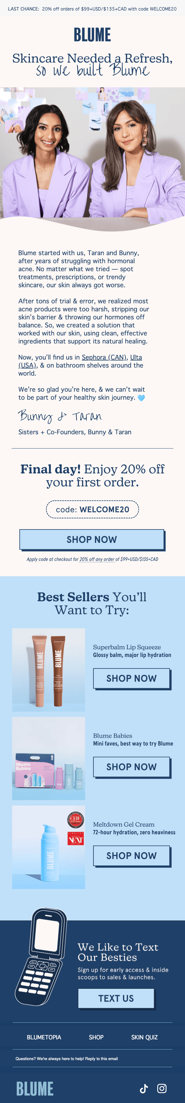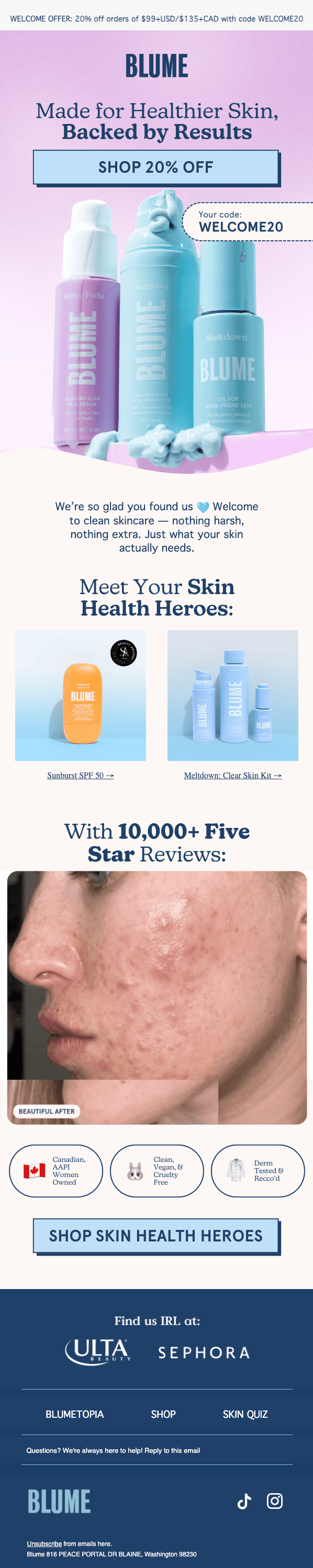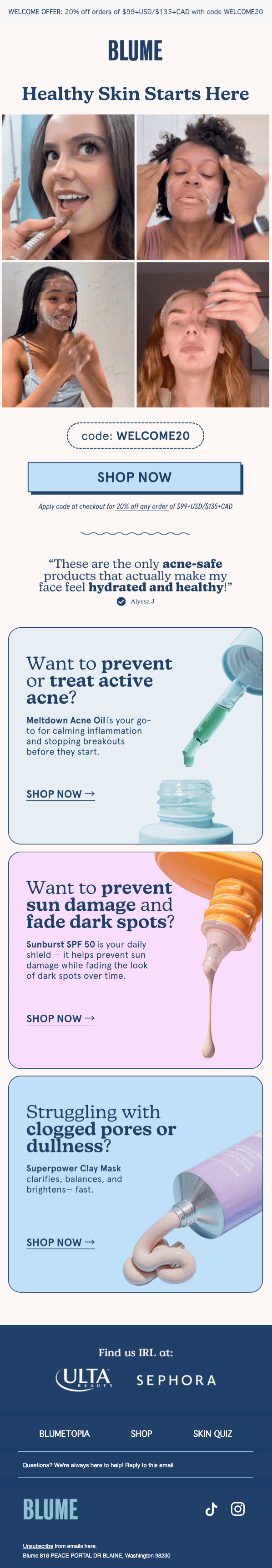 Blume positions itself as clean, gentle skincare made for sensitive and acne-prone skin. Their welcome and follow-up emails keep that mission front and center with a mix of education, heavy social proof, and hard-hitting promos.