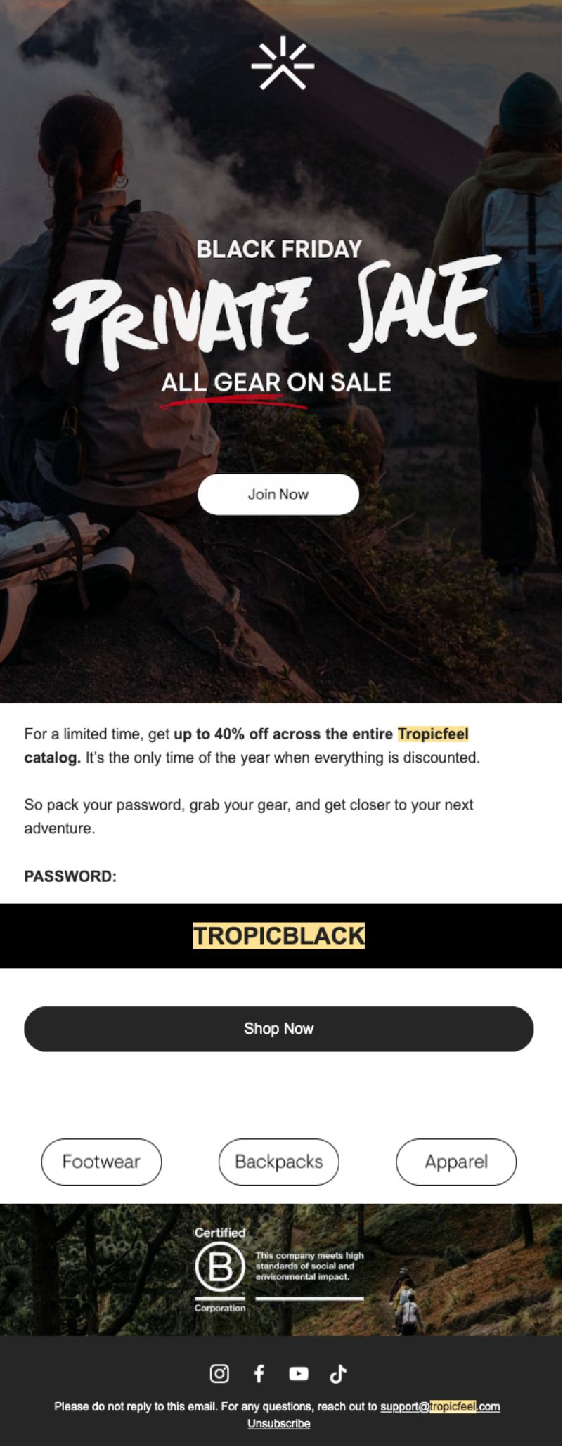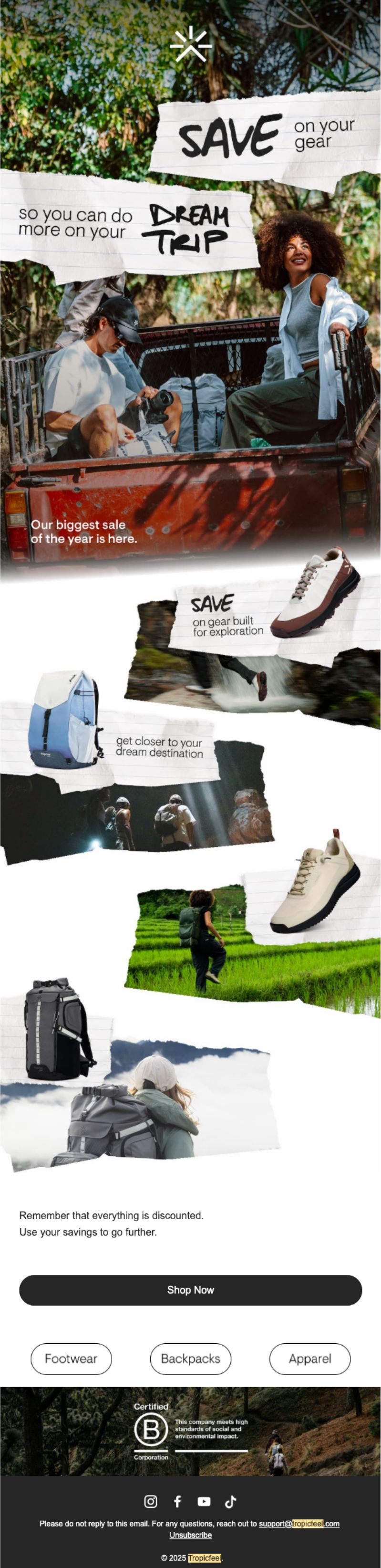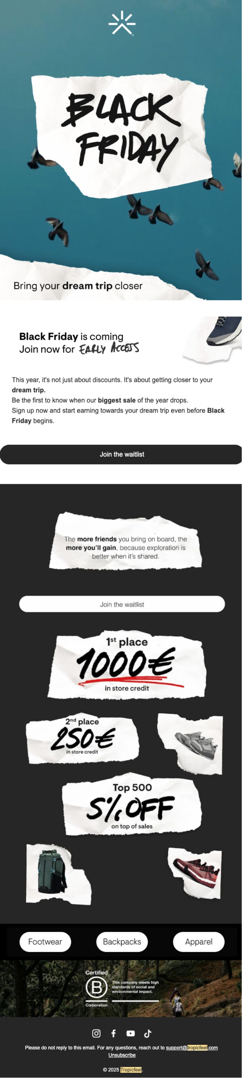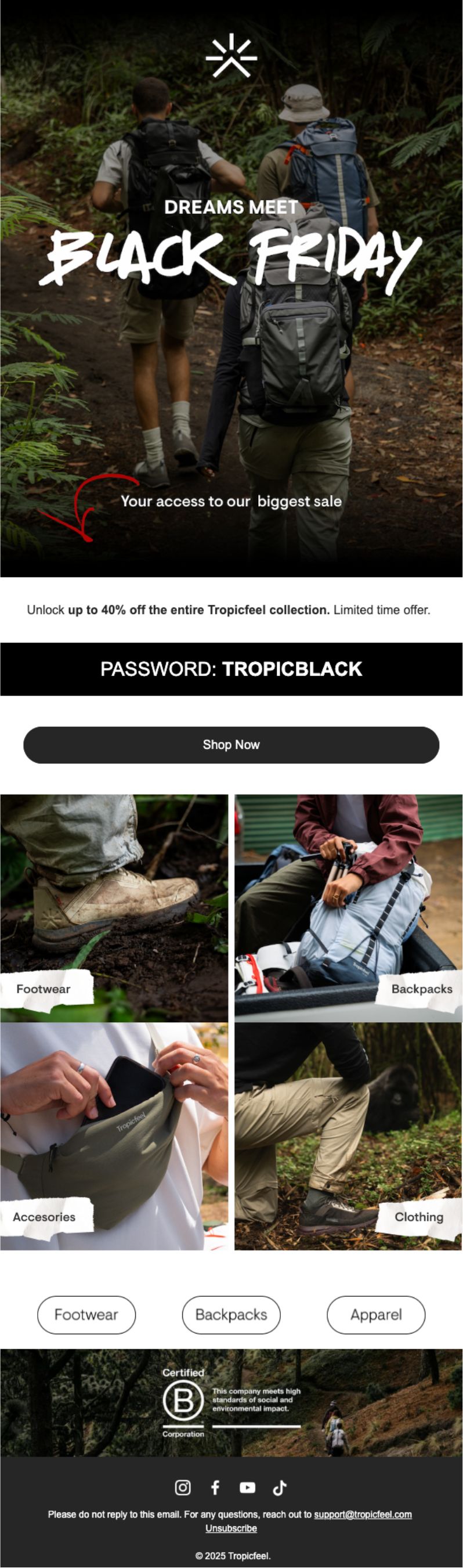 Tropicfeel’s Black Friday campaign is a masterclass in brand alignment. Every touchpoint reinforces the company’s core ethos of exploration and sustainability, turning a typical sale into an immersive brand experience. But with a few tweaks (more variation, stronger product storytelling, and targeted personalization) it could evolve from visually striking to commercially unbeatable.