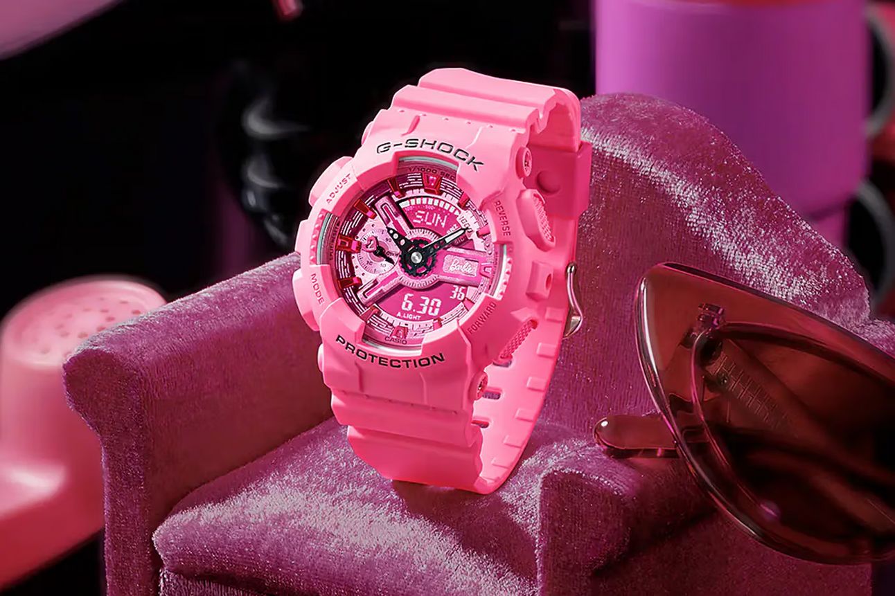 G-SHOCK teamed up with Mattel to introduce a limited edition GMA-S110BE. Dressed in Barbie's signature pink, this timepiece features all right nods to the world-famous doll with heart gears, the iconic Silo Head and