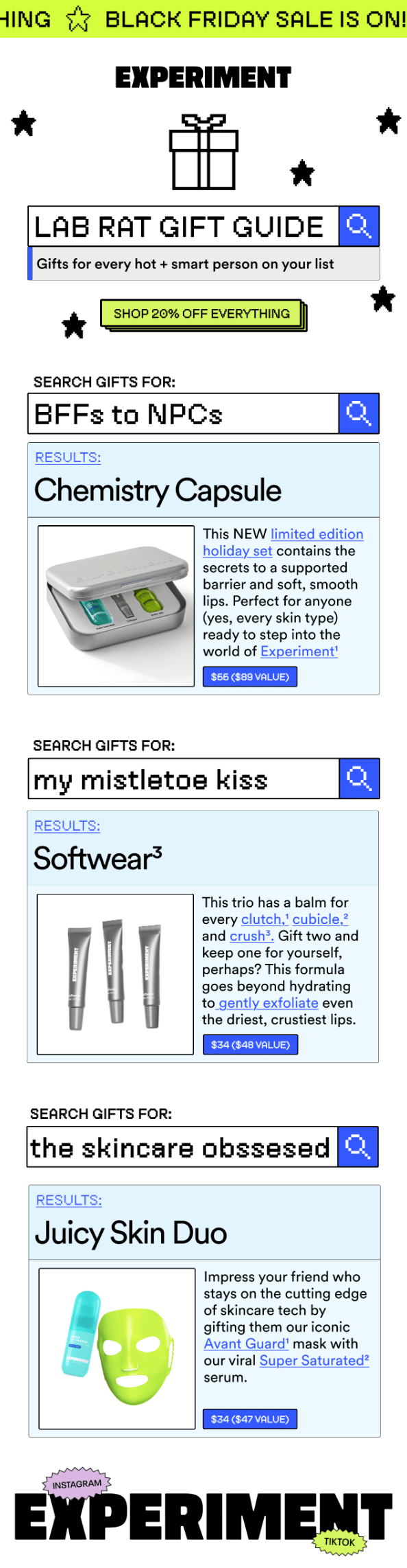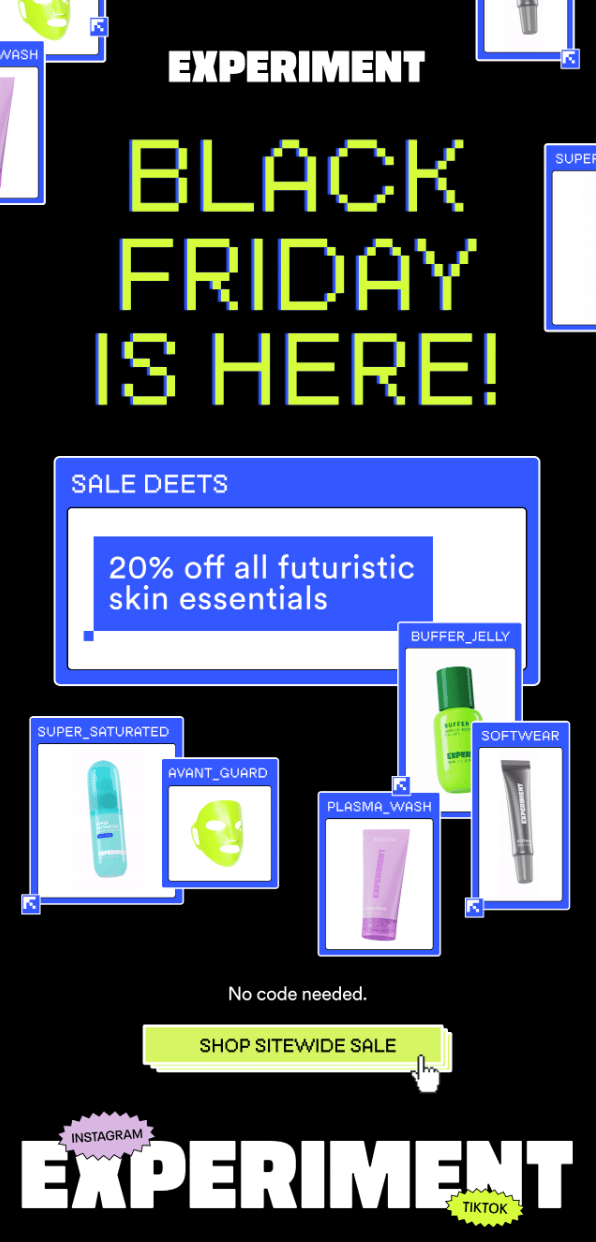 Over 12 emails, the skincare brand turned BFCM into an immersive experience for its “Lab Rats” community, combining science-backed storytelling, cheeky copy, and pixel-art visuals that brought their identity to life.