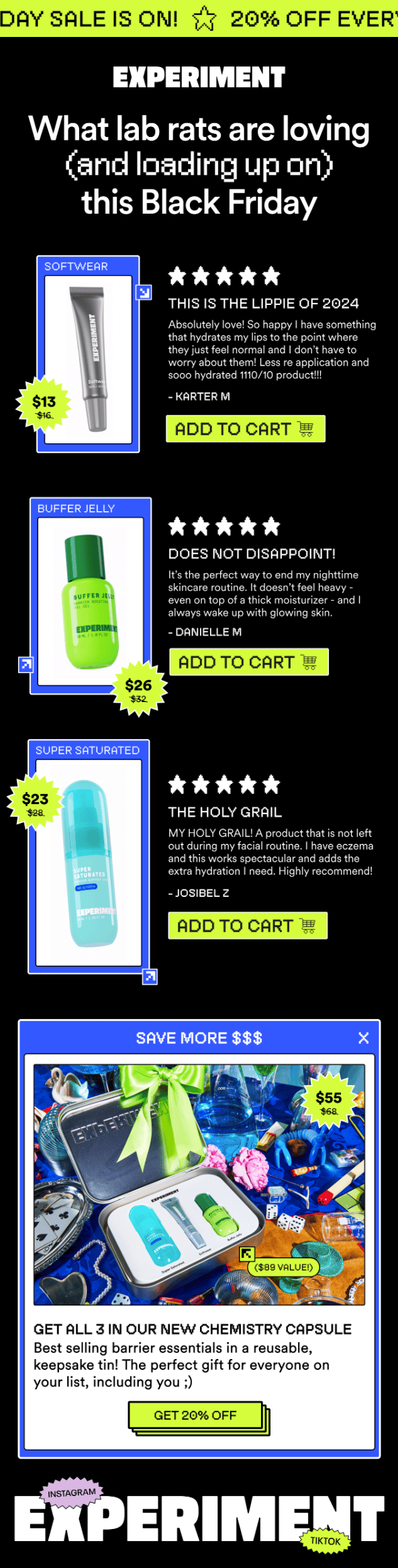 By tightening cadence, layering in personalization, and adding a stronger urgency lever, Experiment could evolve this from a visually memorable campaign to a revenue-maximizing one.