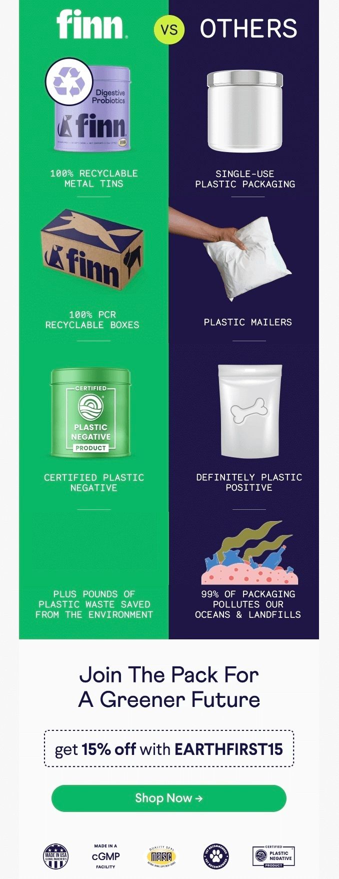 ✔ Smartly placed trust badges. Certifications like GMP, Plastic Negative, and more sprinkled at the bottom reassure customers, and quietly support Finn’s claims with proof that they know what they’re doing.