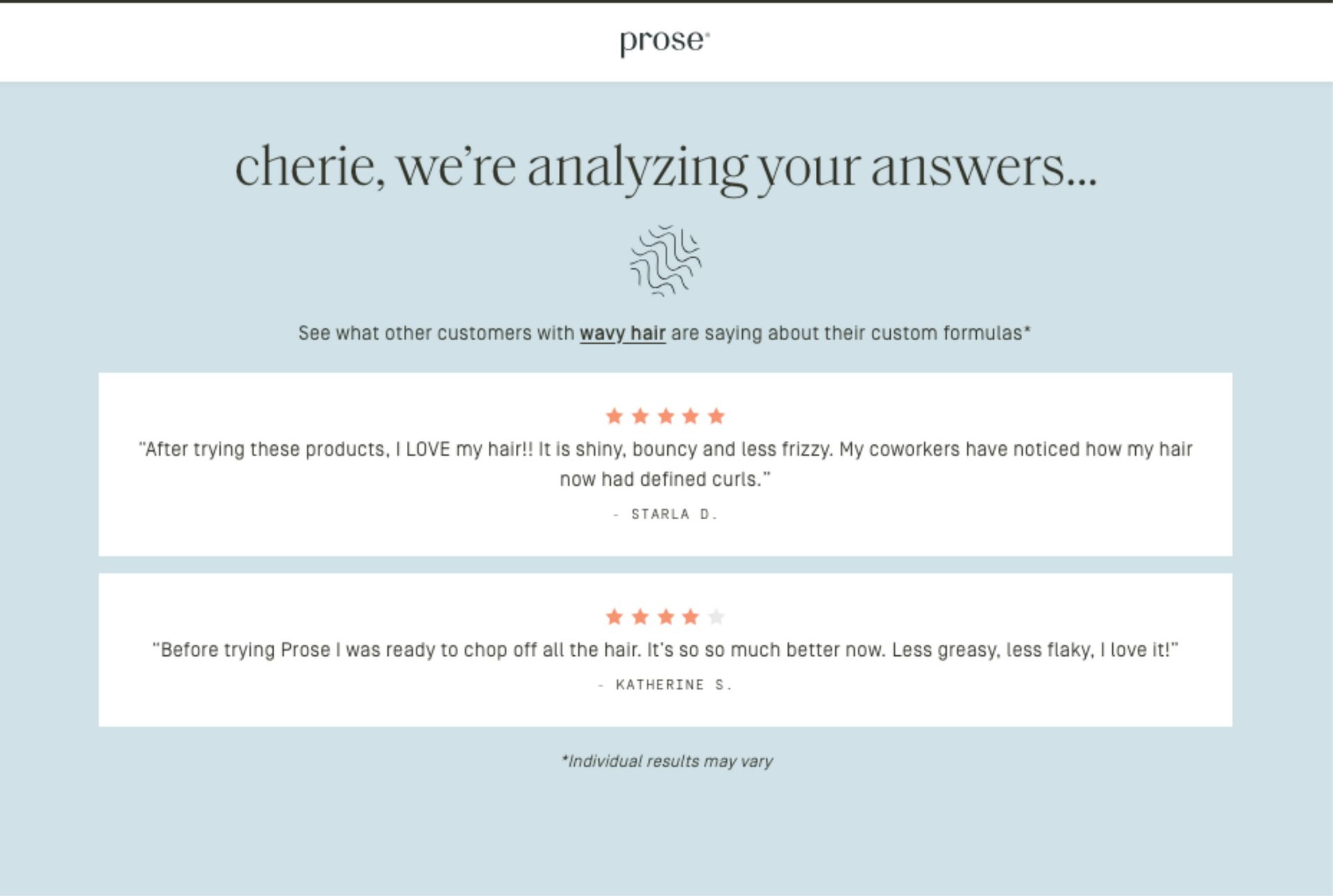 Prose doesn’t leave the user in limbo after submitting their quiz. While results are processing, they surface reviews from customers with the same hair type (in this case, wavy hair), reinforcing that the personalization is real and rooted in outcomes.