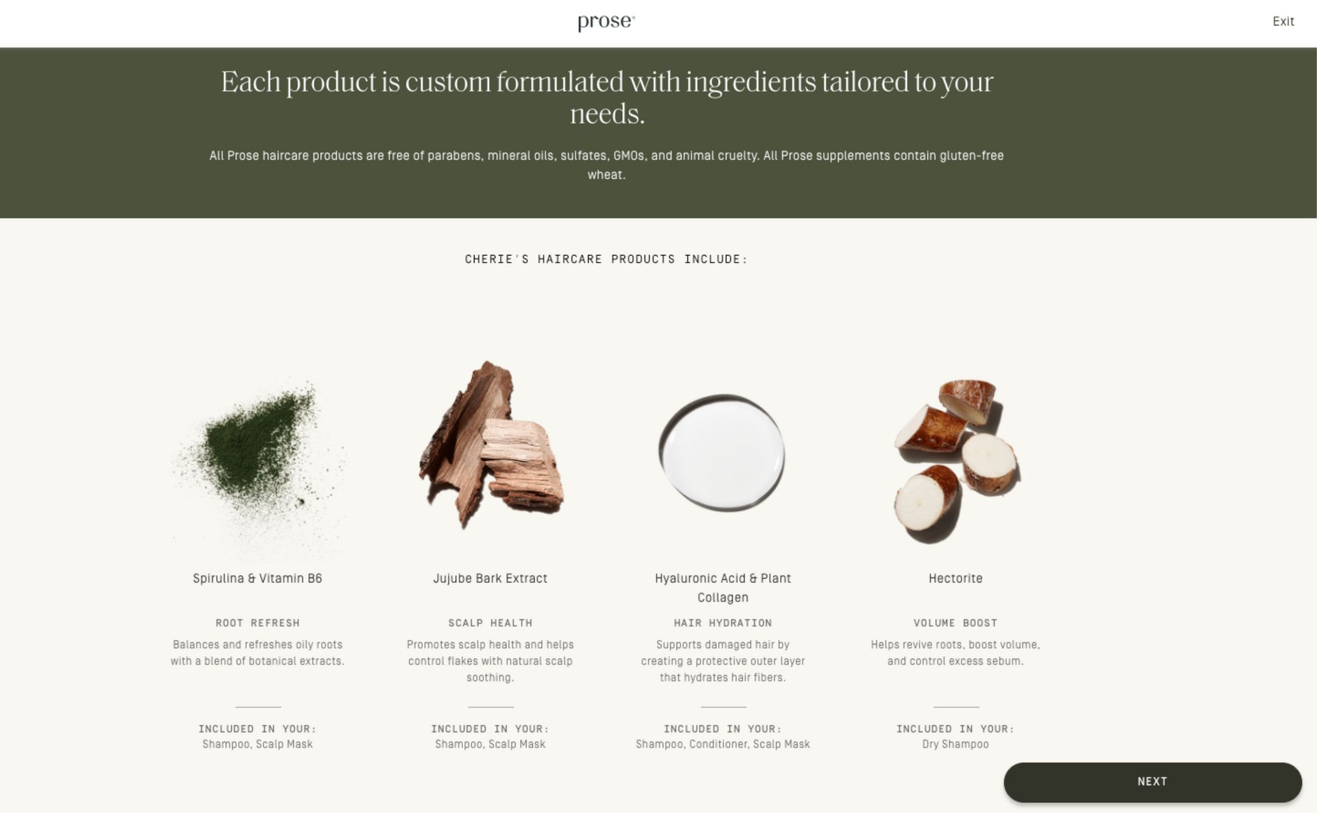 Before you ever see a product bottle, Prose introduces the key ingredients selected for your formula. Each ingredient is tied to a specific benefit making it clear how the formula addresses your exact concerns. This shifts ingredients from a vague buzzword into a value driver.