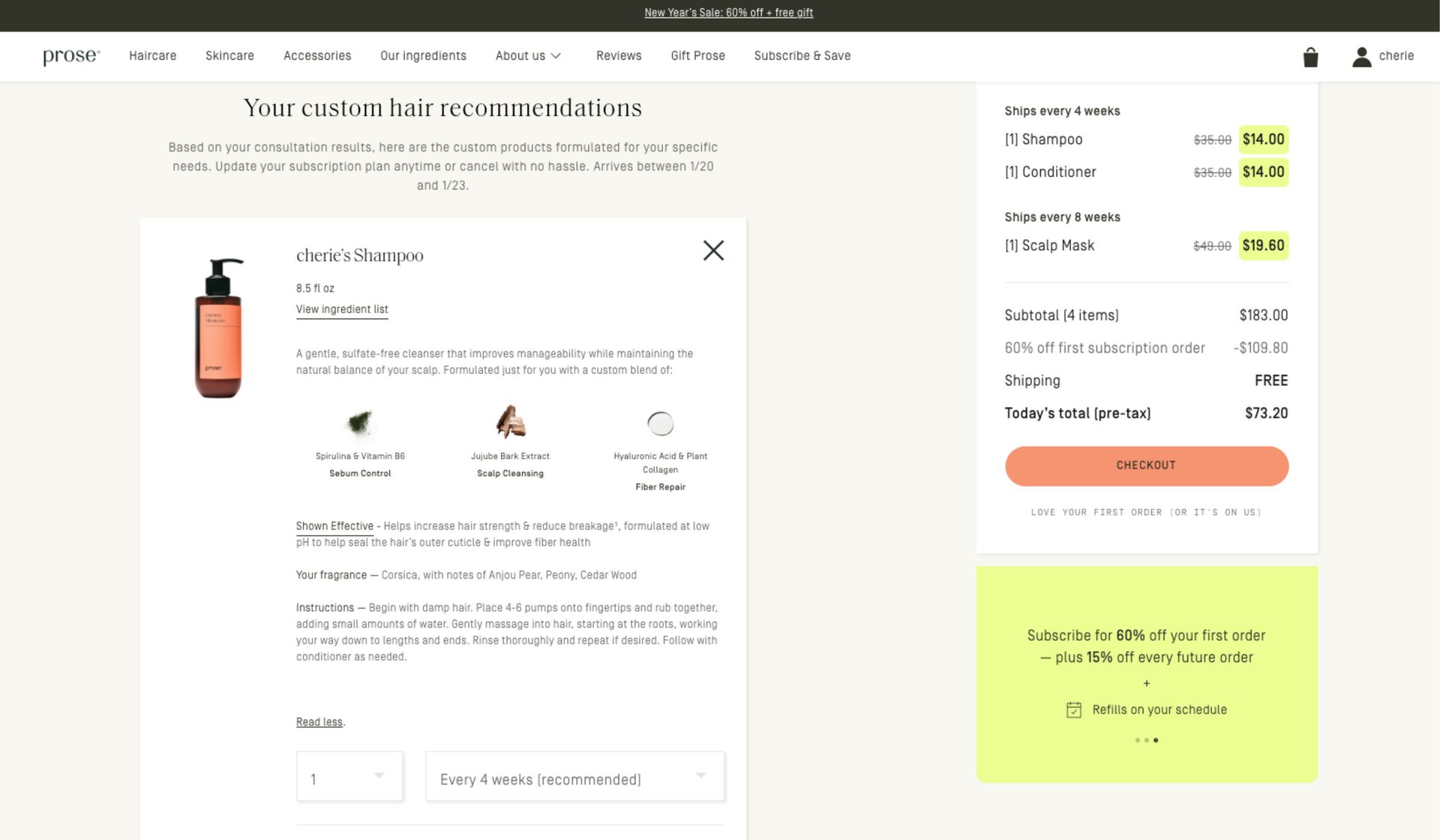 At checkout, Prose continues the education by including usage instructions and cadence guidance. This subtly reinforces the idea that these products are meant to be used consistently, setting the stage for subscription without explicitly pushing it yet.