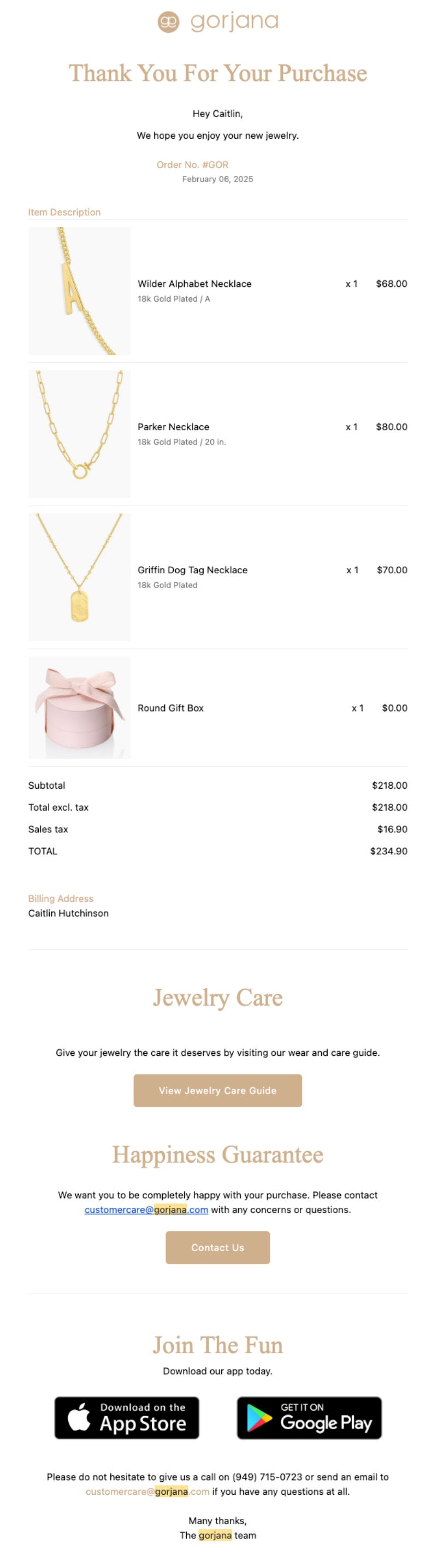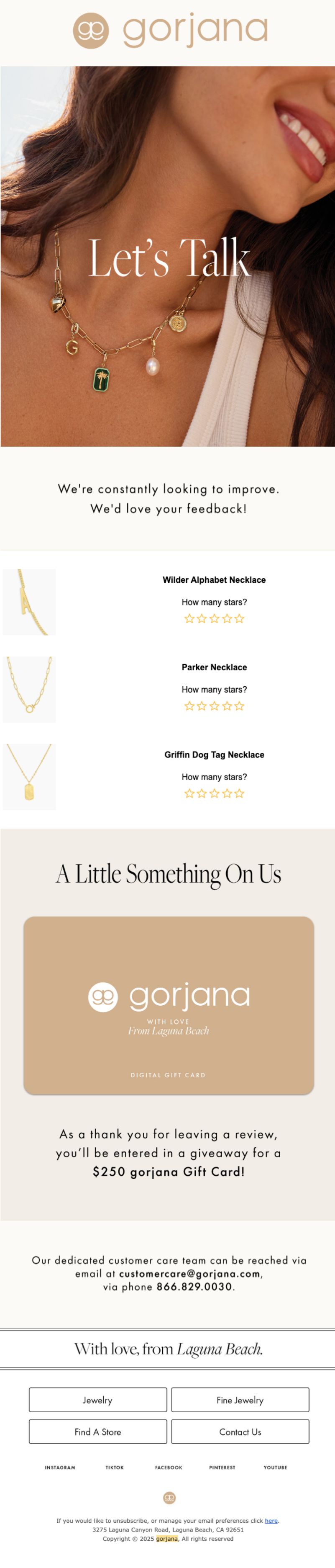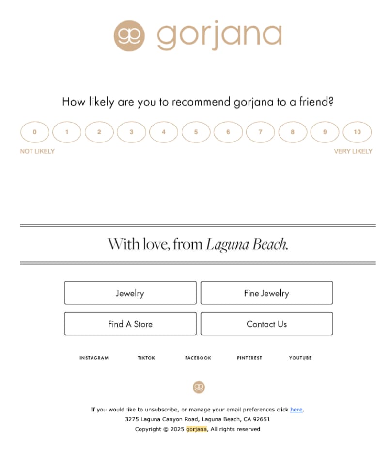 Gorjana sells accessible fine jewelry with California-casual aesthetic through both brick-and-mortar stores and DTC channels. What makes this post-purchase flow notable is that it begins with an in-store transaction and seamlessly transitions into digital relationship building, treating physical retail purchases as entry points for ongoing email engagement rather than one-off transactions.