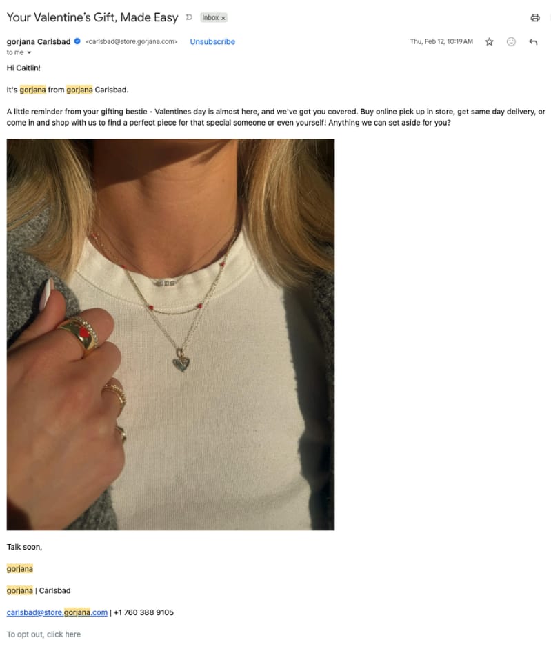 "Talk soon, gorjana" sign-off feels impersonal despite earlier personalized associate email