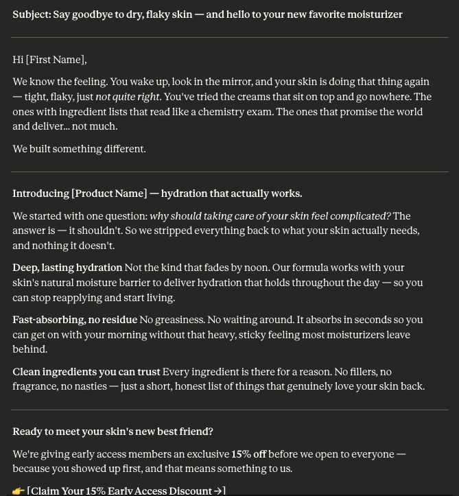 Paste those into AI with this prompt: "Turn these bullet points into a persuasive product launch email. Keep the tone warm and approachable, emphasize the clean ingredients and fast results, and end with a strong CTA for early access."