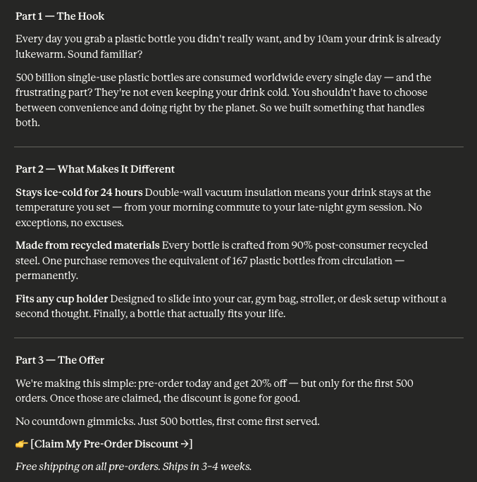 End with a strong CTA that creates urgency: pre-order now for 20% off, limited to first 500 orders."