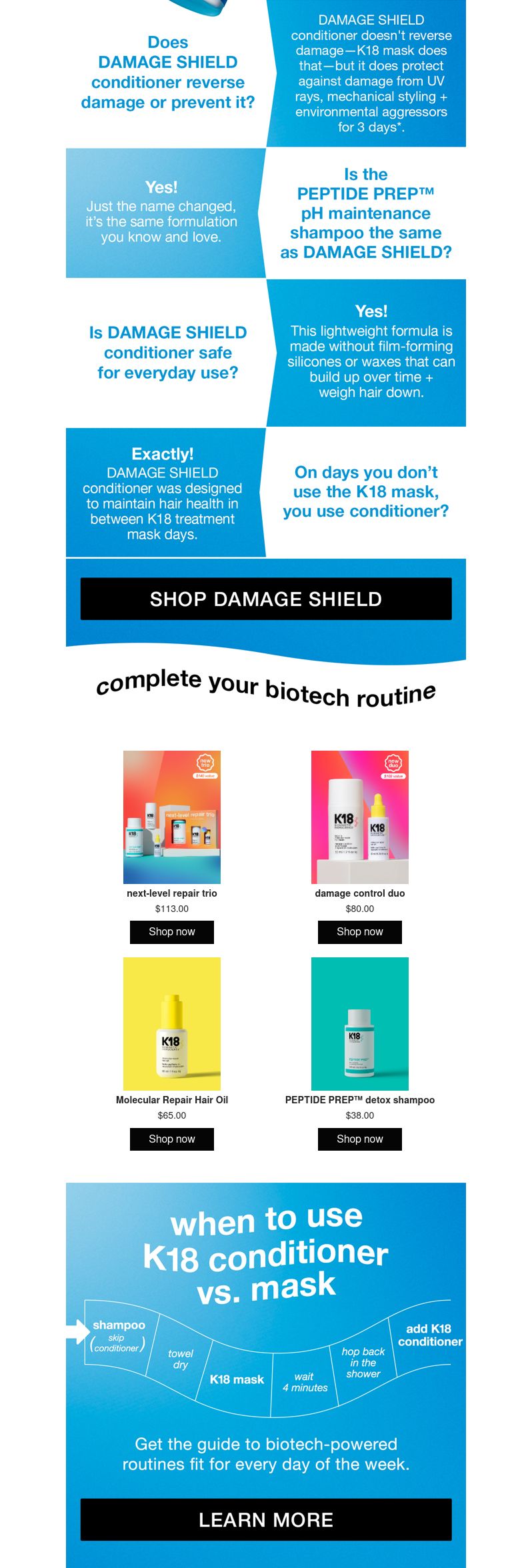 This is a smart retention email from K18. Instead of pushing another average launch email or discount, they slow things down and answer the questions customers are already asking. Does this replace the mask? Can I use it every day? When should I use what?