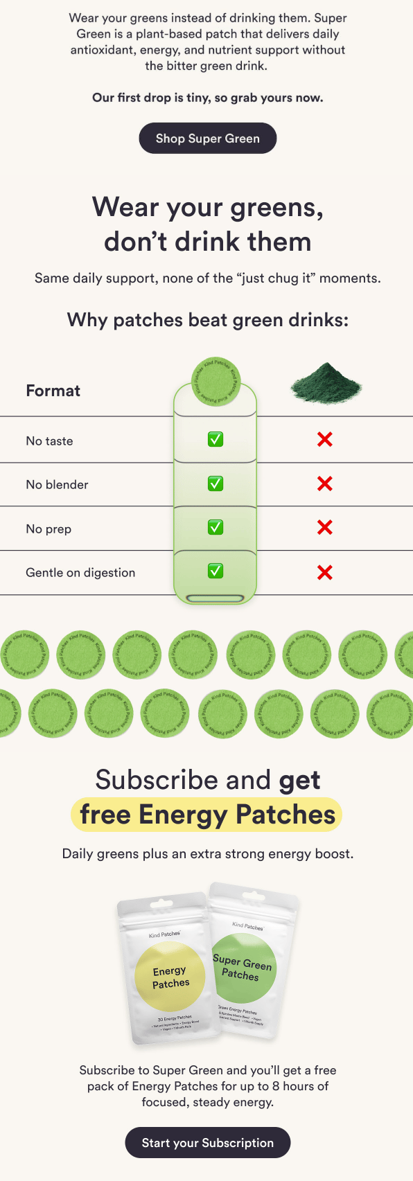 Kind Patches launched their Super Green product, and instead of just listing what it does, they built the entire email around why patches beat green drinks.