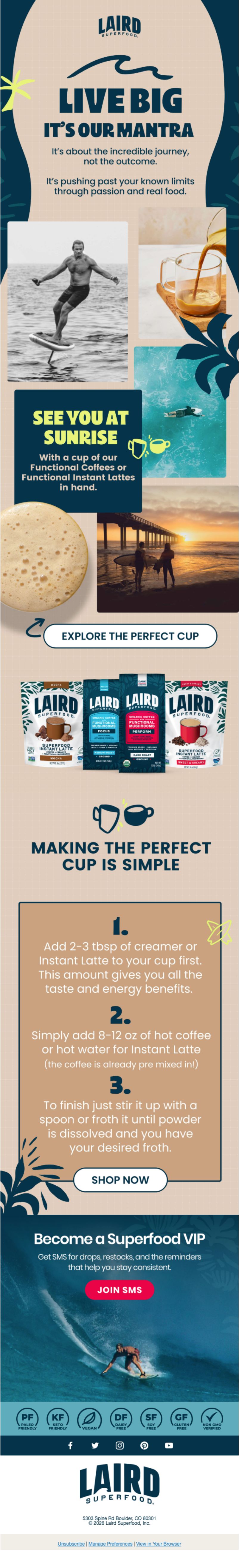 Laird Superfood doesn't treat its welcome flow like a product catalog. Instead, the brand leans into founder Laird Hamilton's extreme athlete credibility, positions superfood as a lifestyle philosophy, and uses aspirational imagery to sell a way of living before pushing individual SKUs.