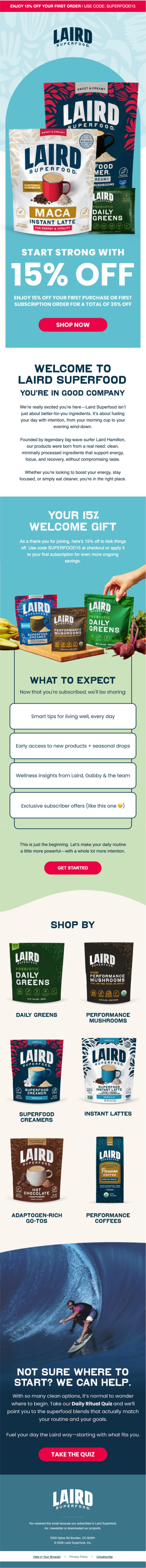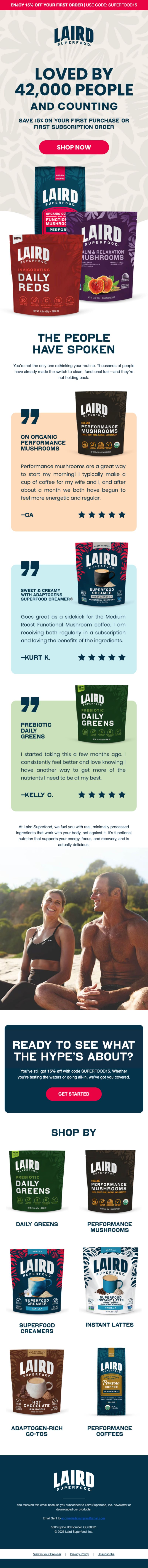 Laird Superfood welcome flow: Lifestyle first, product second, founder always