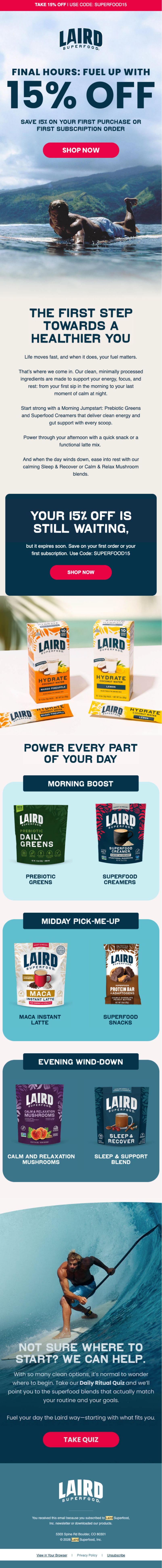 Laird Superfood proves that authentic founder credibility can carry a welcome flow. By leading with Laird Hamilton's extreme performance background, the brand creates a permission structure to charge premium prices and build aspirational positioning.
