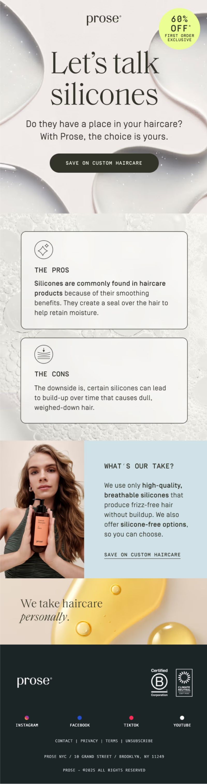 Prose educates subscribers about a haircare ingredient (silicones) by laying out both pros and cons. This builds credibility because they're not just pushing their product, they're helping people make informed decisions. Only after educating do they share their approach (high-quality, breathable silicones with silicone-free options).