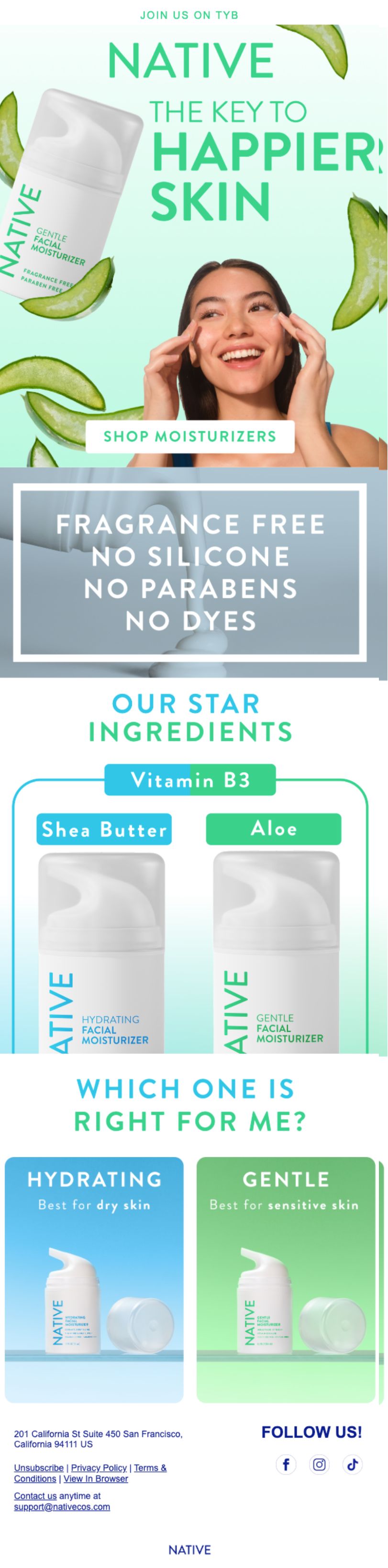 Native simplifies the decision between two moisturizers by clearly laying out who each one is for (dry skin vs. sensitive skin). The star ingredients are highlighted, the visual comparison is clean, and the choice feels easy instead of overwhelming.
