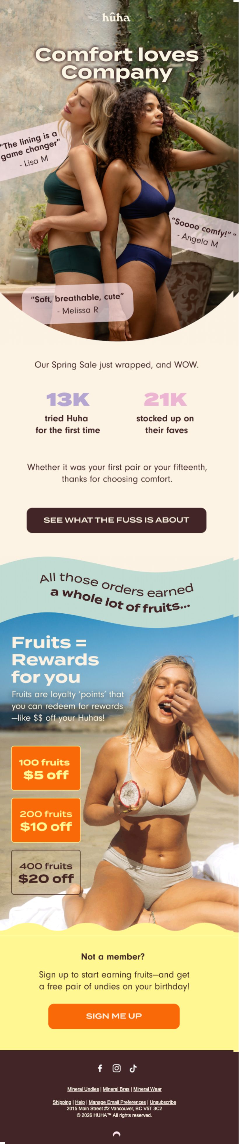 Huha wraps their loyalty program announcement in a celebration of their spring sale success. By sharing specific numbers (13K first-time customers, 21K stocked up) and customer quotes, they create FOMO and community feeling before introducing the rewards program.