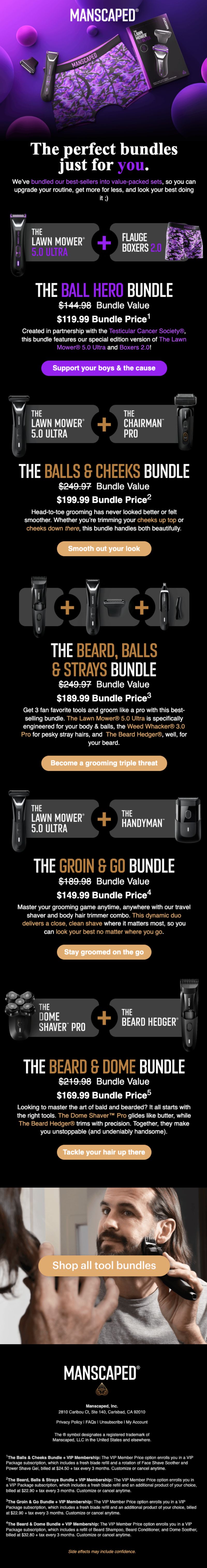 Manscaped presents multiple bundle options with clear value propositions. Instead of making customers build their own kit, they've done the work of pairing products that make sense together. Each bundle has a name that communicates the benefit ("The Beard, Balls & Strays Bundle").