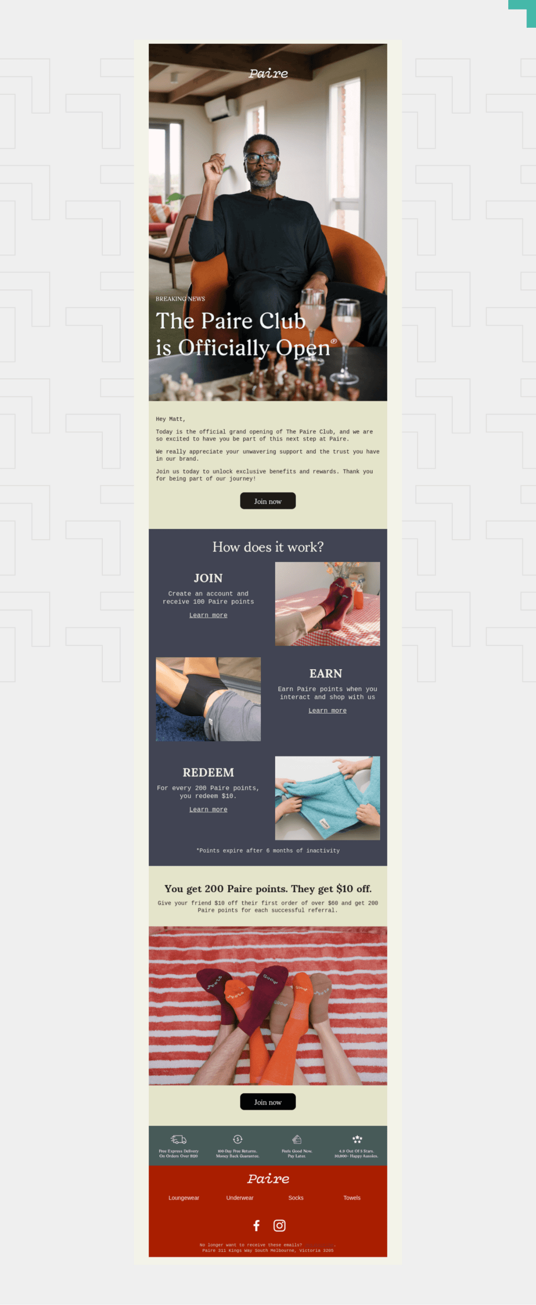 If you already have a program up and running, invite recent shoppers to join in. Or, make this the perfect time to get started—consider setting up a program that rewards customers based on their holiday purchases. Take this example from Paire: