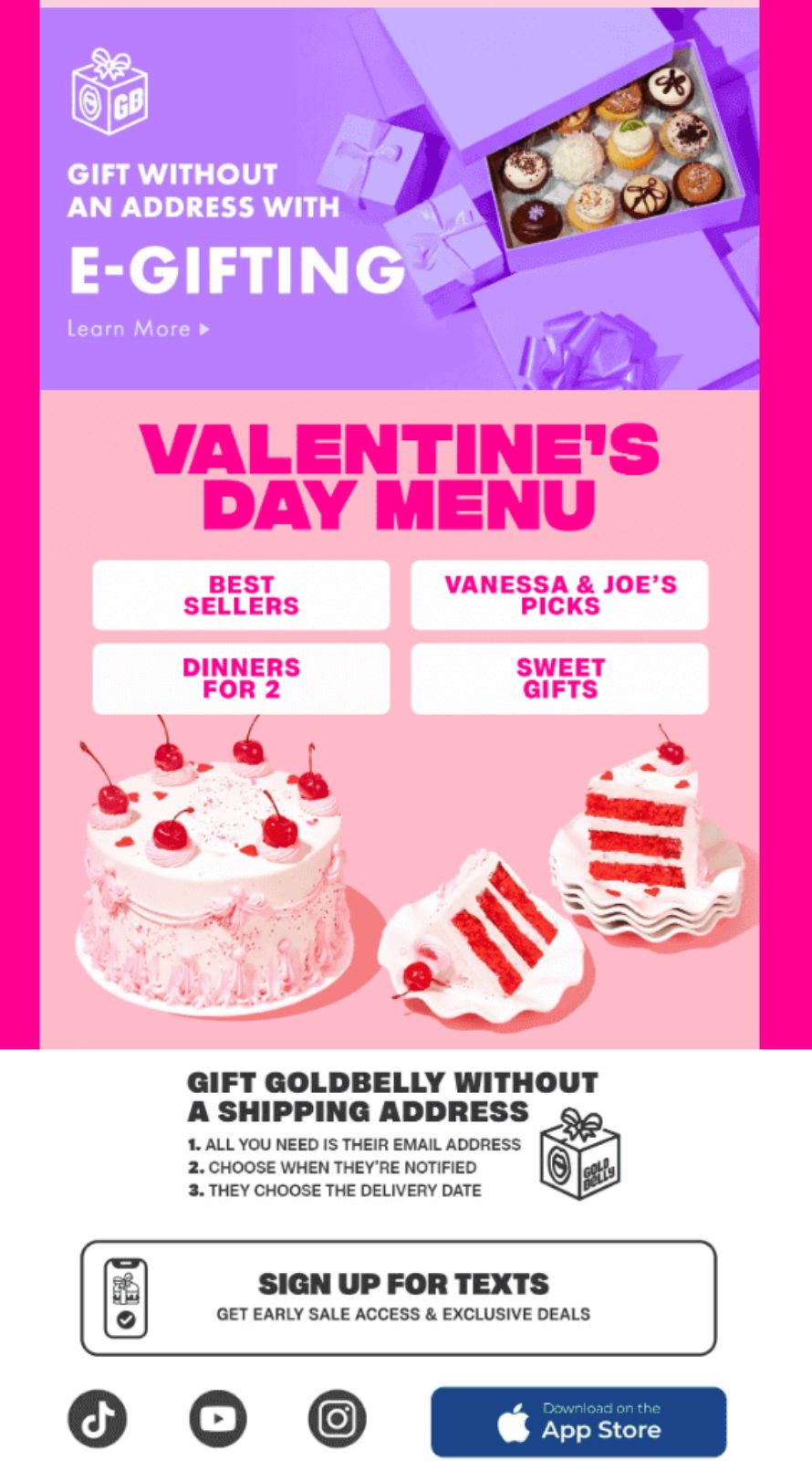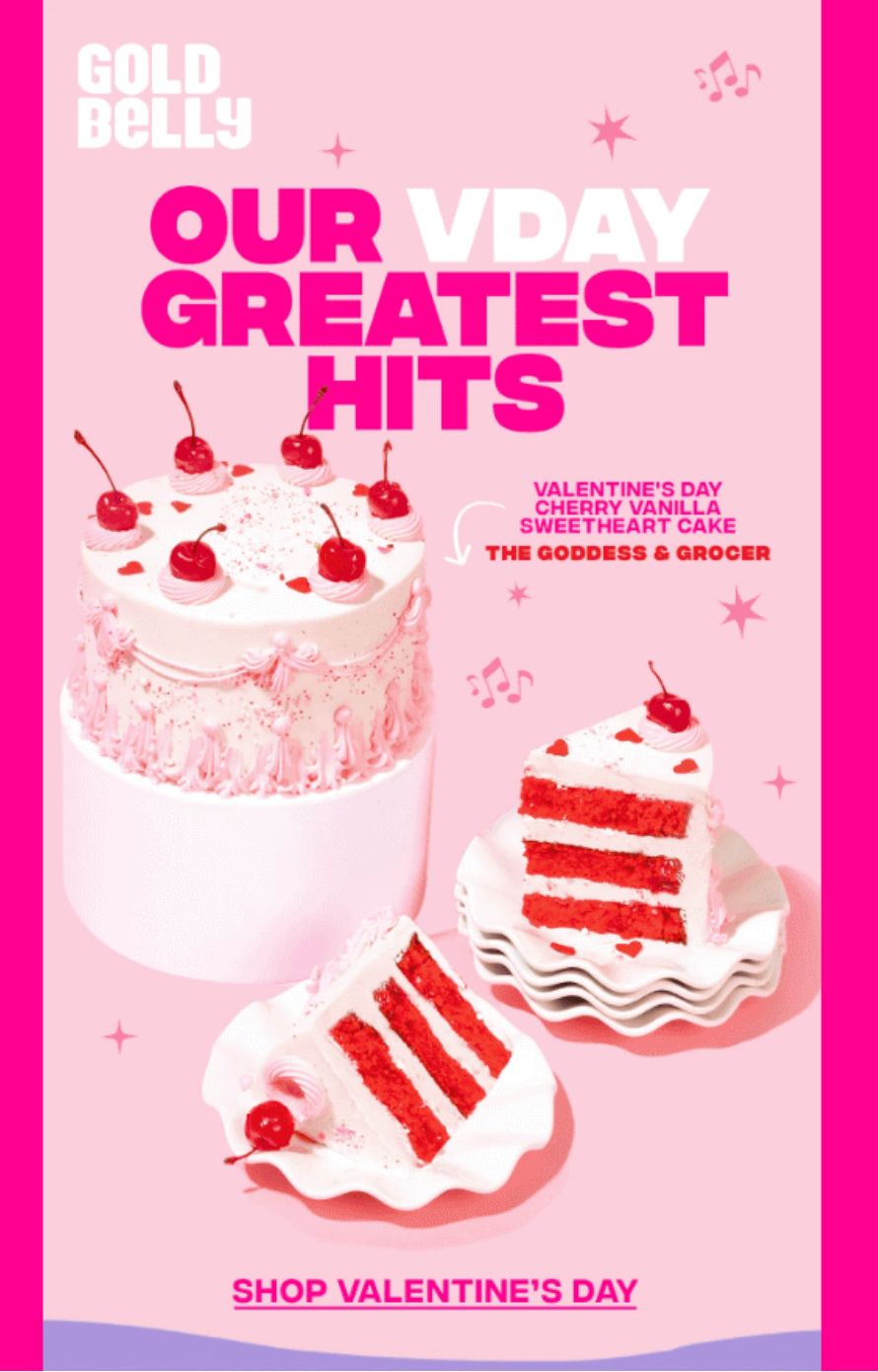 ✔ Super on-brand and festive. The bold typography and bright, pink colors immediately set the mood. It looks like Goldbelly, feels like Valentine’s Day, and grabs attention fast.