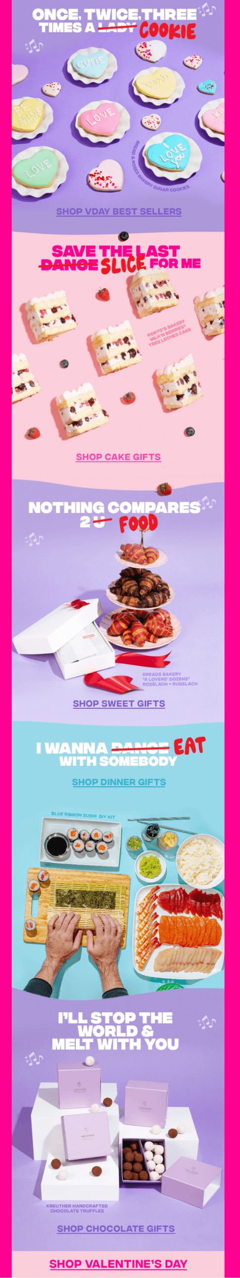 ✔ Clever, playful copy. The email leans into its music theme with song-inspired headlines like “Once, Twice, Three Times a Cookie.” It’s quirky, creative, and ties back to the Greatest Hits headline, turning the entire email into an experience.