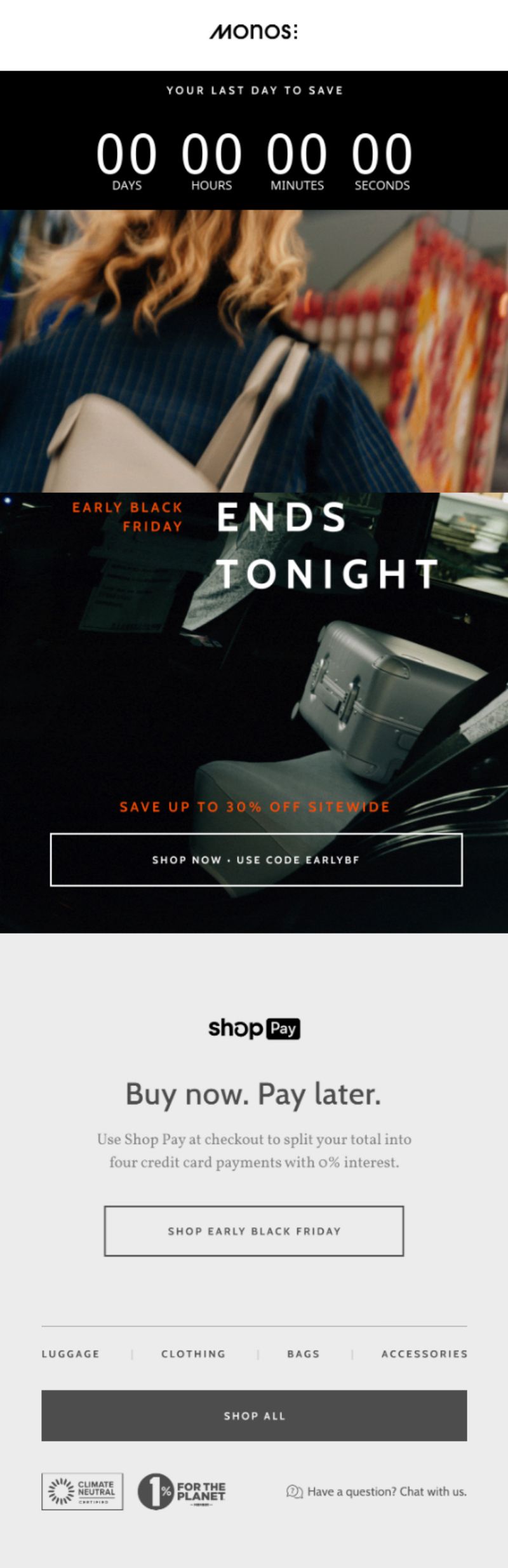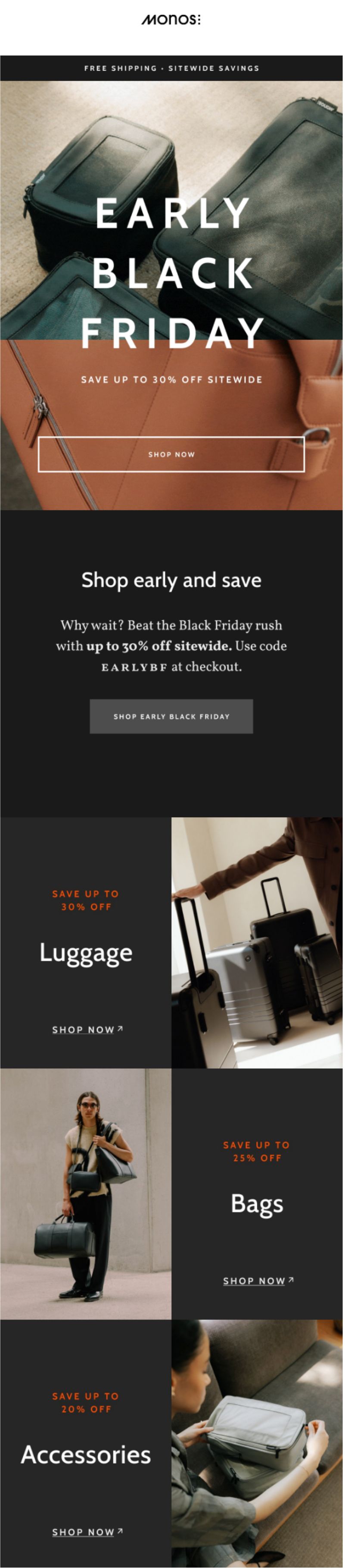 This kickoff email announced Monos’ early Black Friday sale, promoting up to 30% off sitewide with categories like luggage, bags, accessories, and clothing.