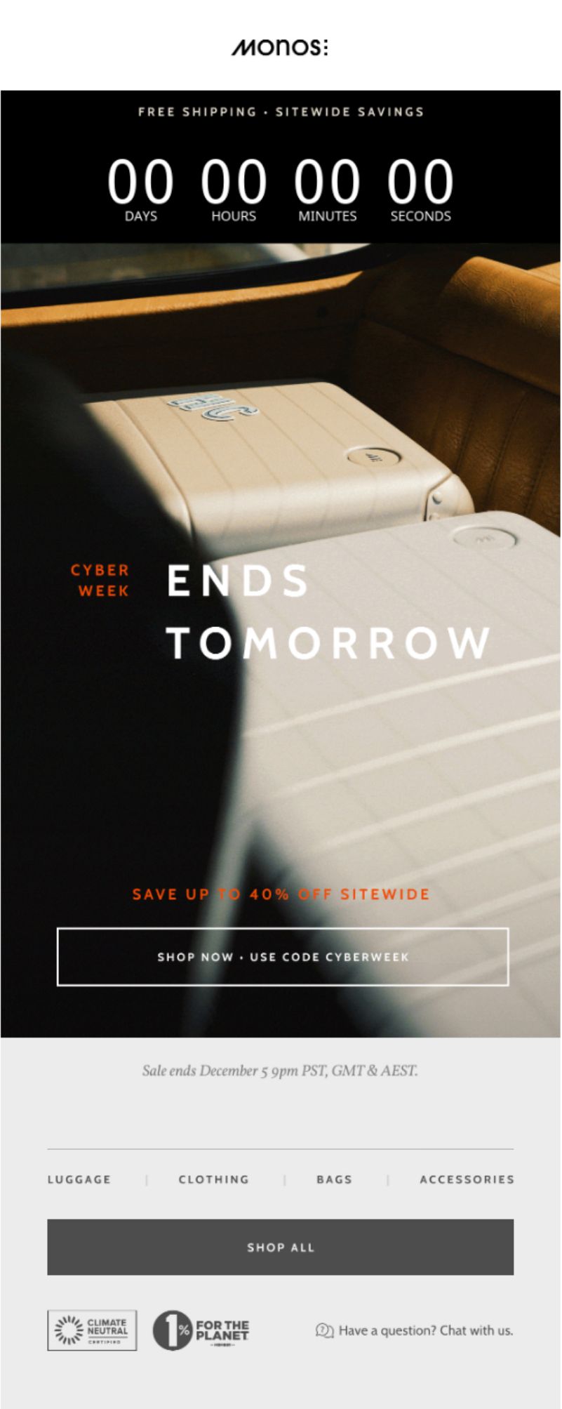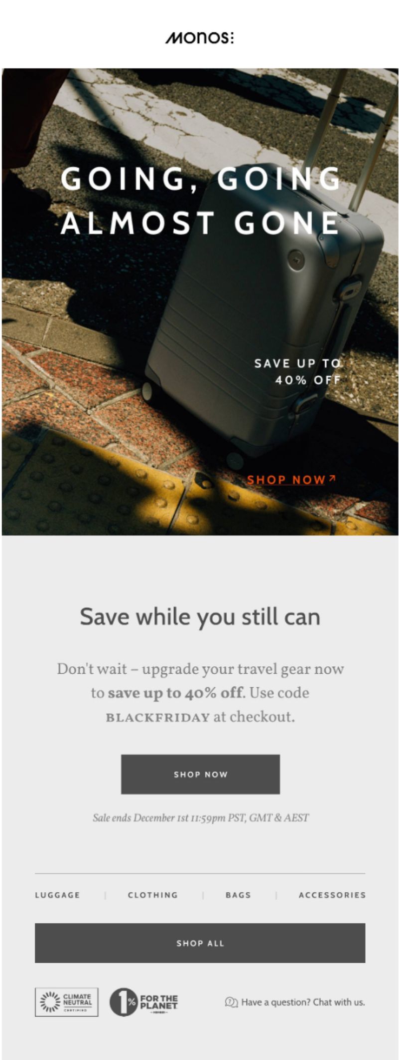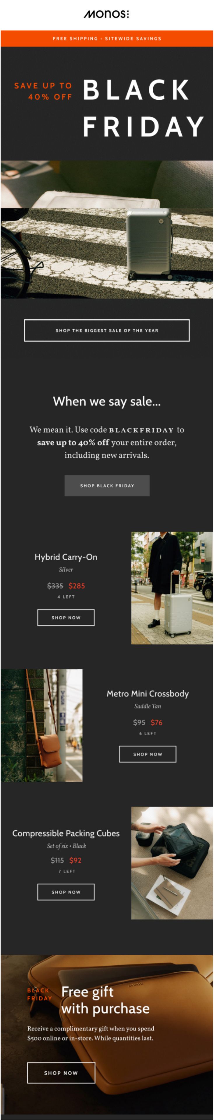This was the centerpiece send - a bold announcement of Monos’ biggest sale of the year, upgrading discounts to 40%. Product highlights included luggage, accessories, and even a free gift with purchase offer.