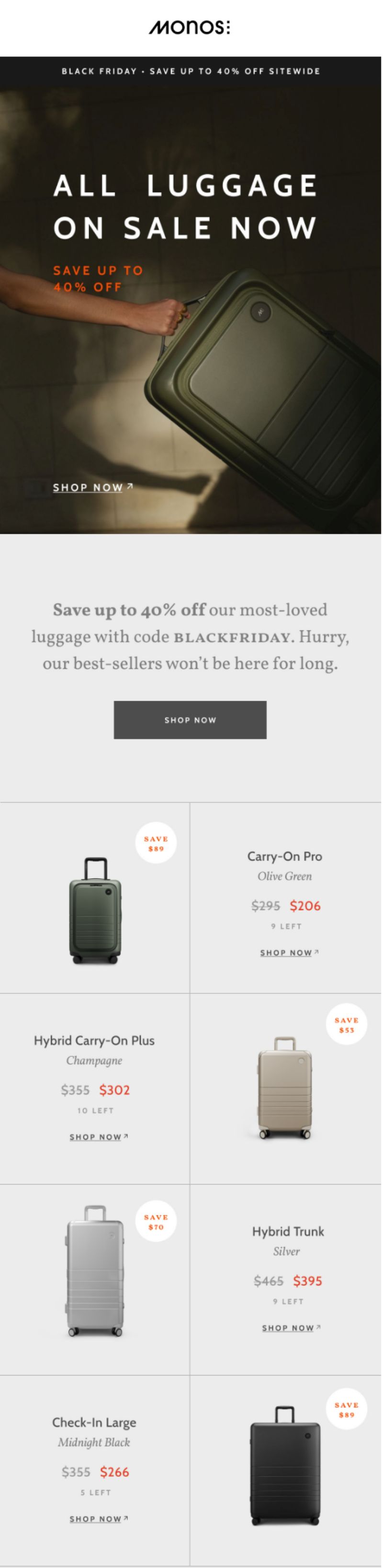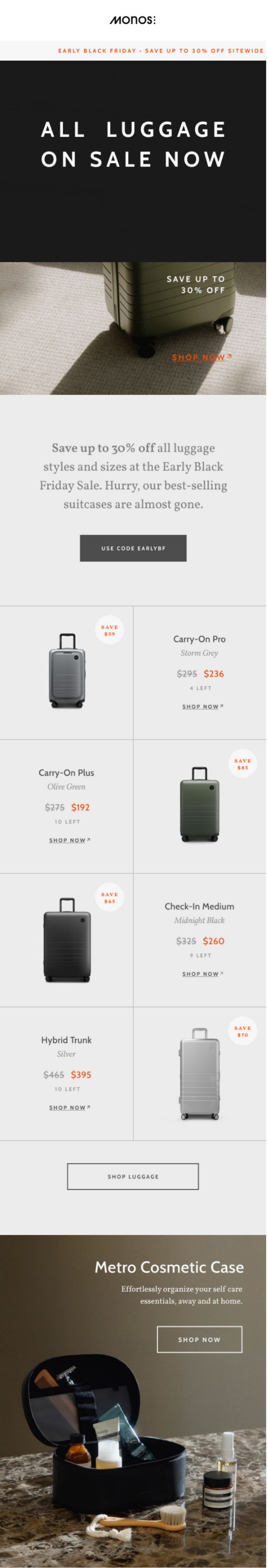 Here, Monos zoomed into their hero product category: luggage. The email highlighted best-sellers, discounts, and even scarcity messaging with “only 4 left” tags.