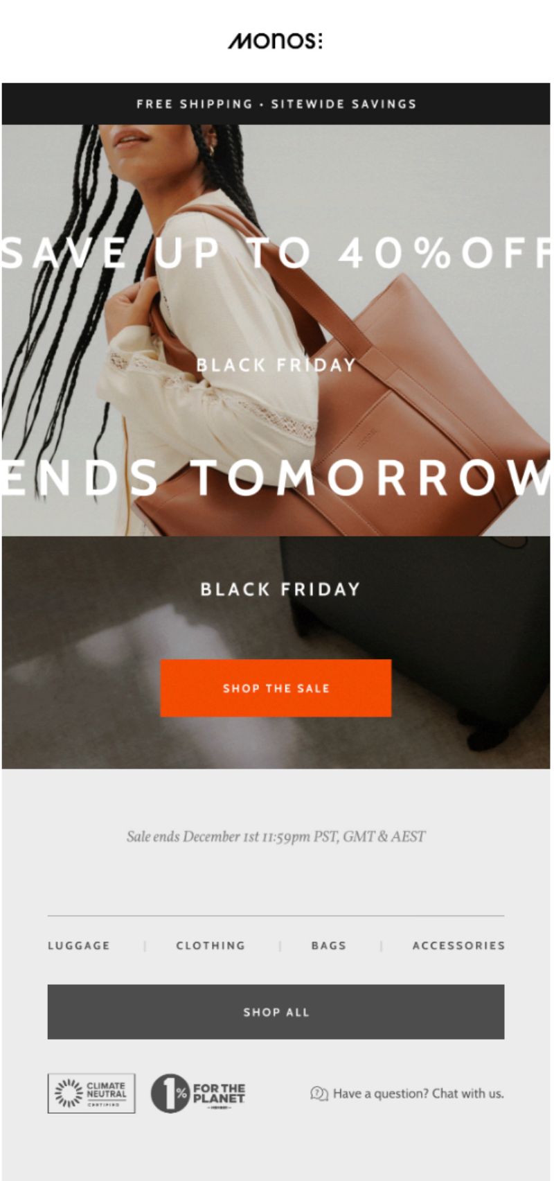 Instead of one big drop, the brand stretched its sale across November with early teasers, category spotlights, and urgency emails stacked with countdowns and “Final Call” shoutouts. The strategy kept Monos top of mind, building steady pressure that pushed shoppers toward checkout.