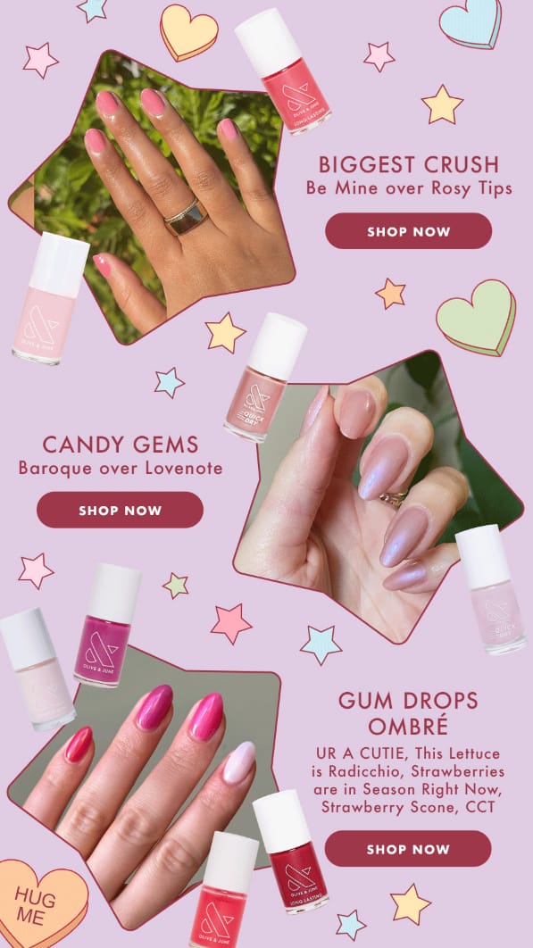 Olive & June leans all the way into Valentine’s energy with this send, but underneath the hearts and candy colors is a really smart merchandising play. This email doesn’t just showcase new shades. It teaches customers how to layer them, which quietly turns a single polish browse into a two-product cart.