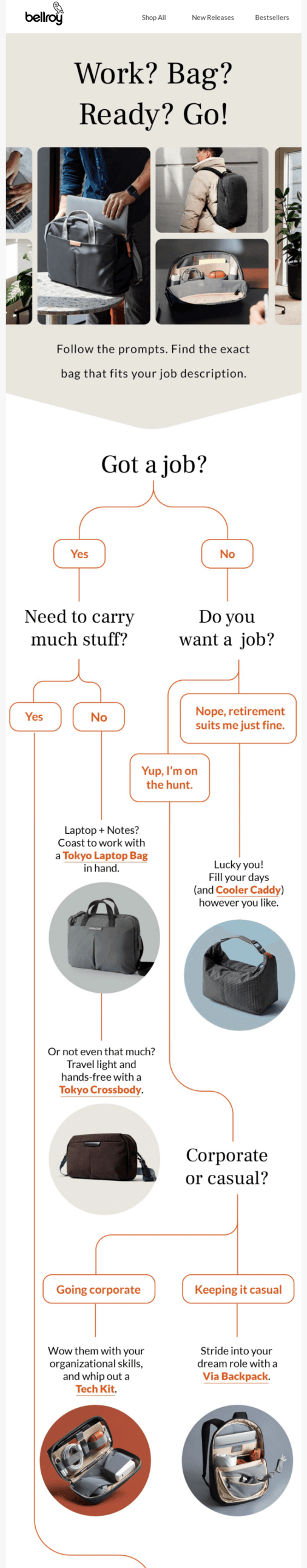 📝 Example: Bellroy takes a smart, customer-first approach by sending an interactive quiz that not only helps them understand shoppers’ needs but also introduces them to products they’ll love. This personalized experience makes the shopping journey smoother, guiding customers toward the perfect purchase while subtly reinforcing brand trust.
