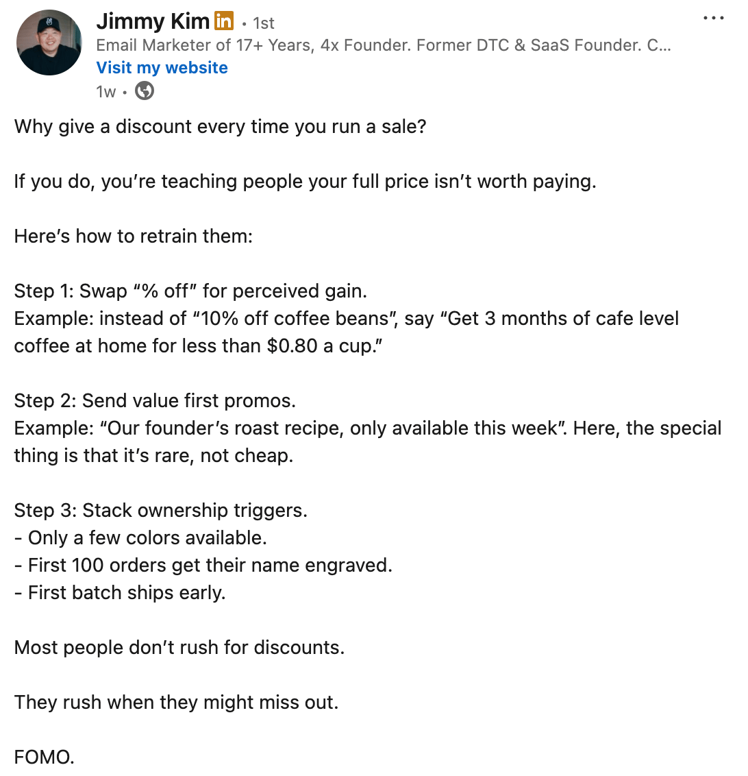 When you run a sale, the default move is to slash prices. But Jimmy’s reminding us that training customers to only buy at a discount is a fast way to tank your full-price value.