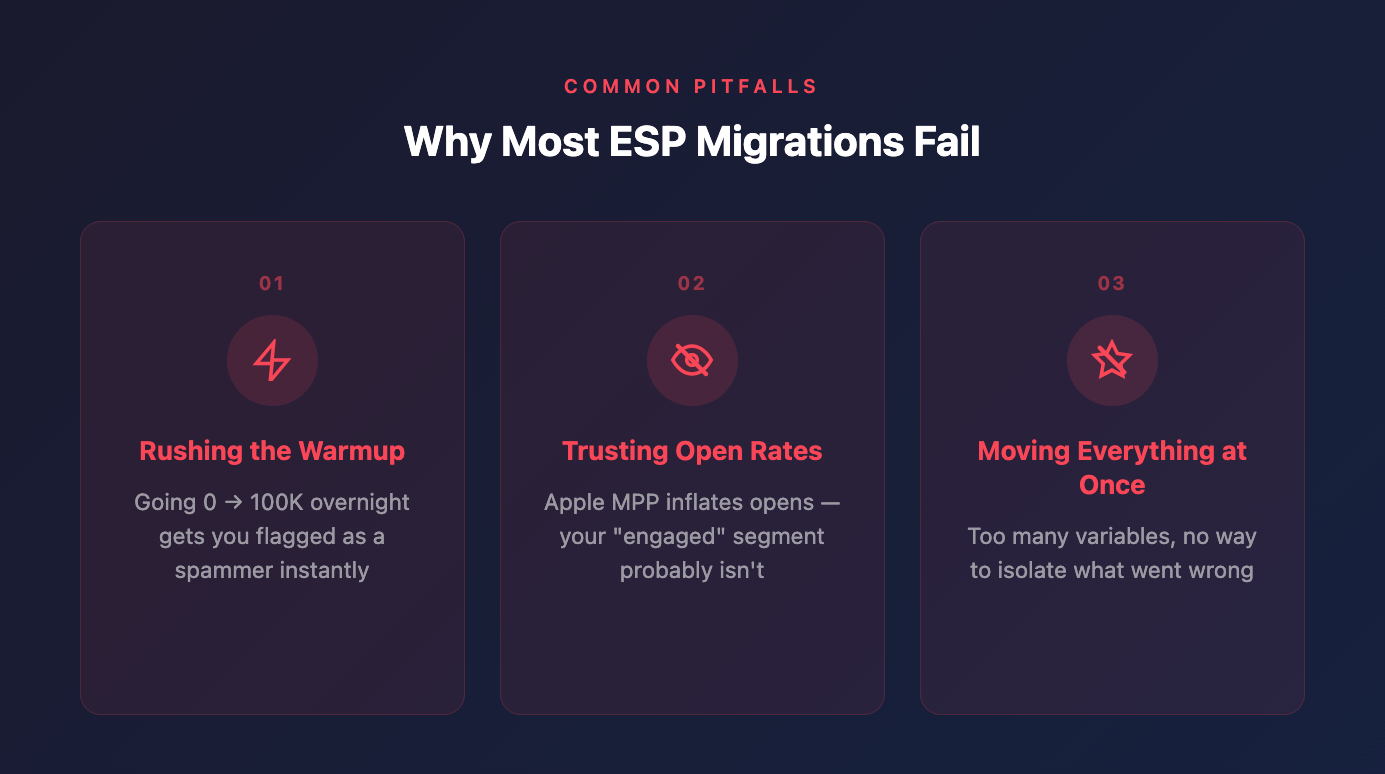 Moving everything at once. Trying to migrate your entire email program, all your automations, and your full list in one shot is a recipe for chaos. Too many variables, too many things that can break, and no way to isolate what went wrong when deliverability tanks.