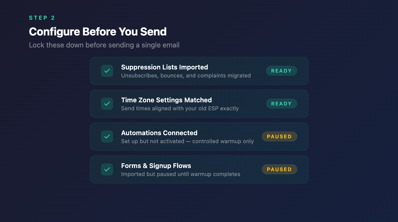 Integrations and automations. Set everything up, but don't activate it yet. You need a controlled environment during warmup. Every email sent should be part of your planned rollout, not an automation that fires unexpectedly.
