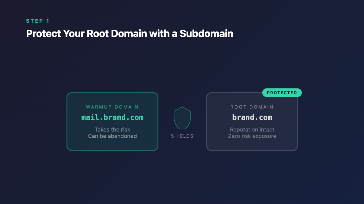 Here's why: if your warmup goes sideways, you can abandon the subdomain without damaging your root domain's reputation. But if you warm up on your root domain and things go badly, you've just torched your primary sending domain and there's no easy way to recover.