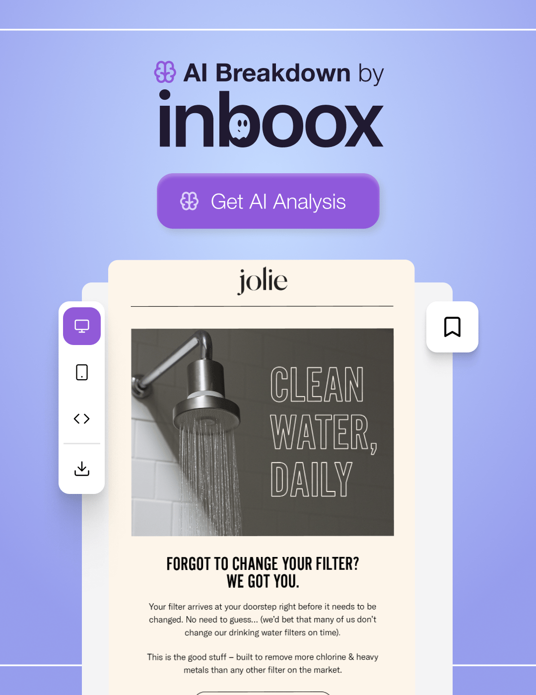Inboox's AI Breakdown pulled apart this retention email from Jolie and found a masterclass in simplicity. The header hits with "CLEAN WATER, DAILY," the body keeps it tight with one short paragraph and a clean product visual, and the CTA is direct enough that you don't have to think.