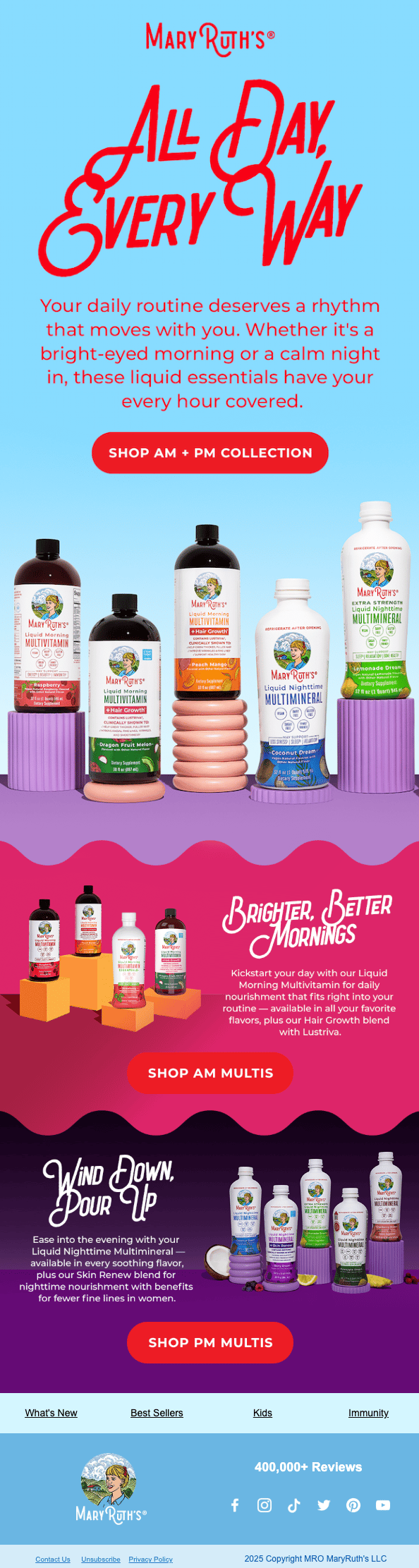 MaryRuth’s shows how strong CTAs work in practice with bold, high-contrast buttons that clearly direct shoppers into AM or PM product collections.