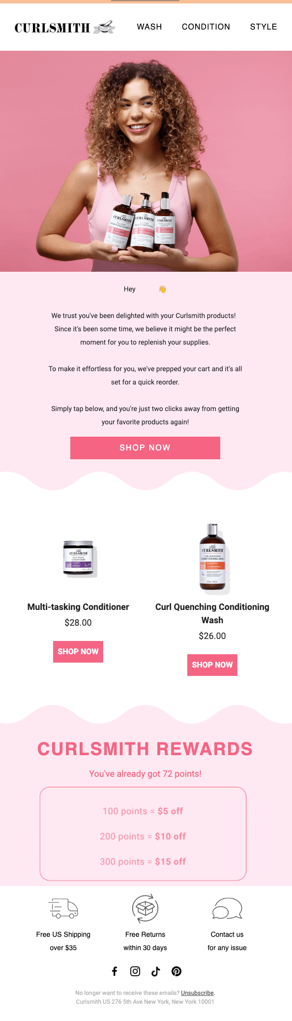 Curlsmith does this well by sending a personalized replenishment reminder based on past purchase timing, complete with a prepped cart that removes all friction.
