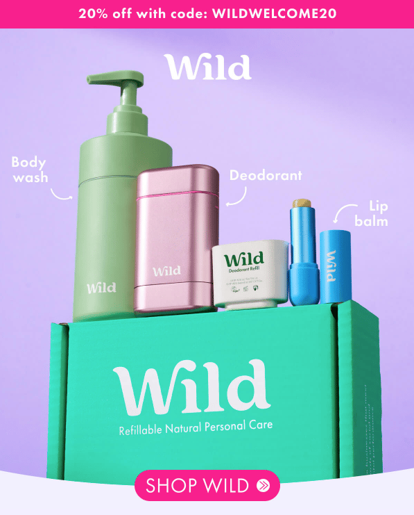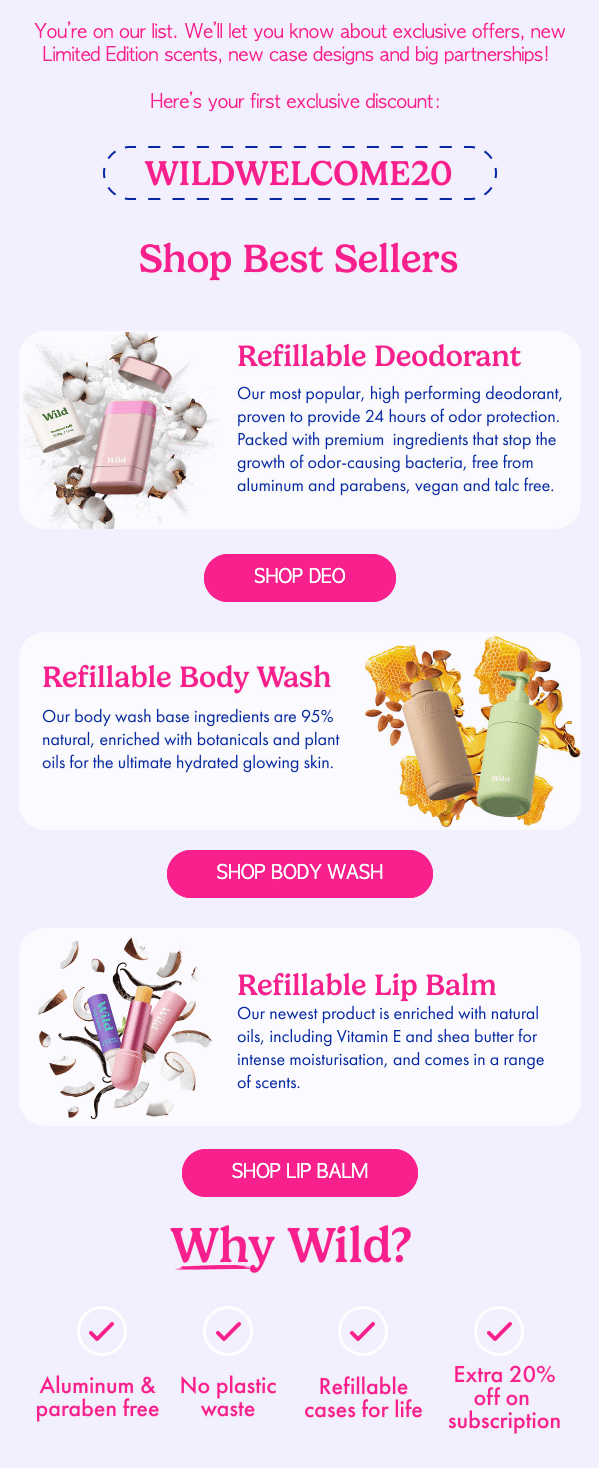 Wild’s welcome email does a great job of showing new subscribers who they are from the first scroll. The visuals are bright, the layout is clean, and the hero image immediately introduces their core refillable products.