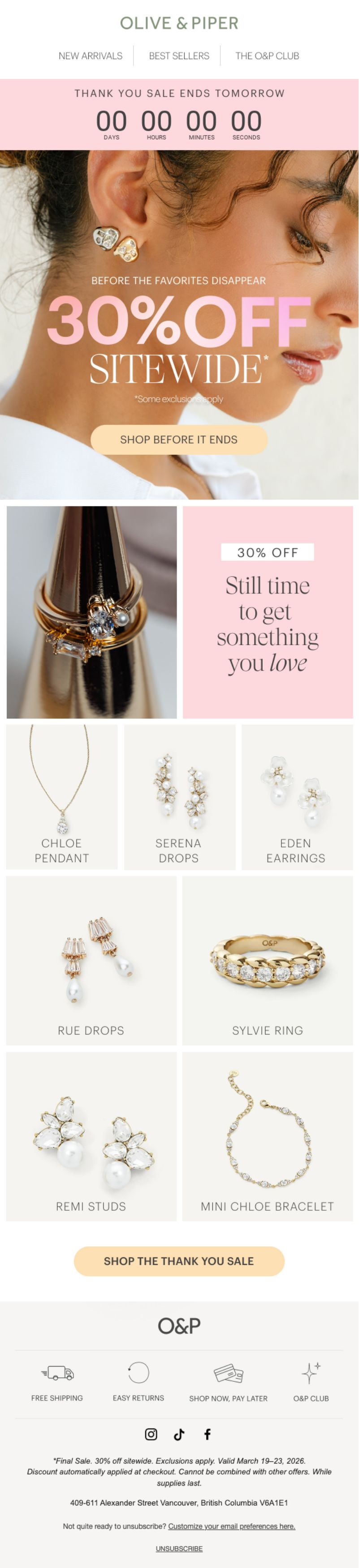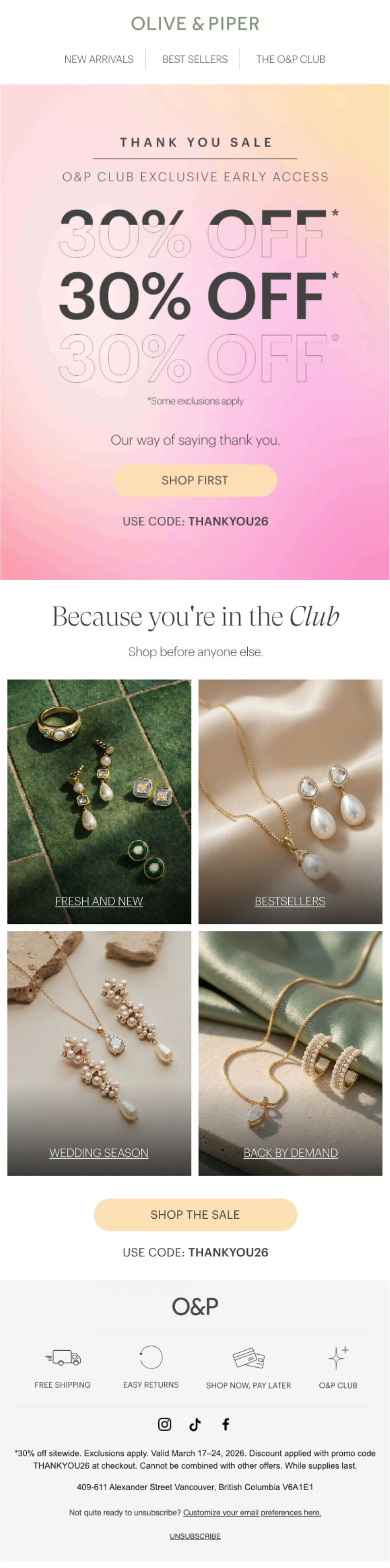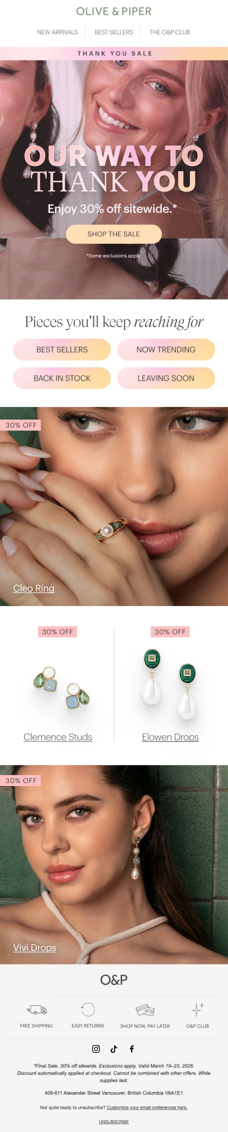 Olive & Piper sells accessible fine jewelry with a focus on everyday elegance and trend-forward designs. Their "Thank You Sale" positions 30% off as gratitude for O&P Club members (their loyalty program), creating exclusivity around what could be a standard sitewide discount.