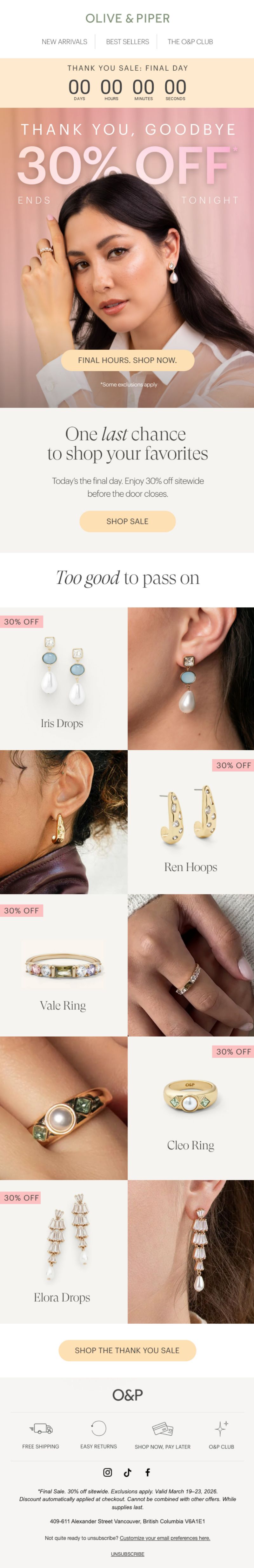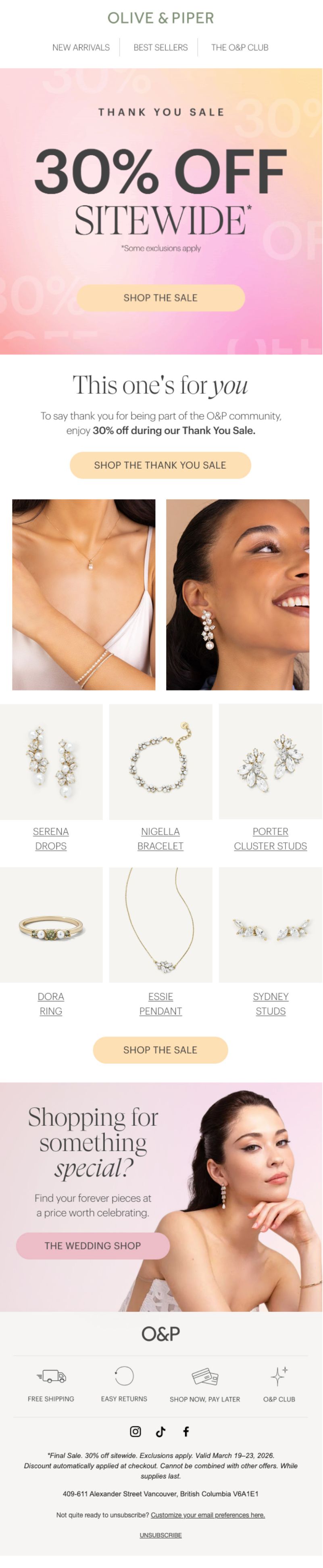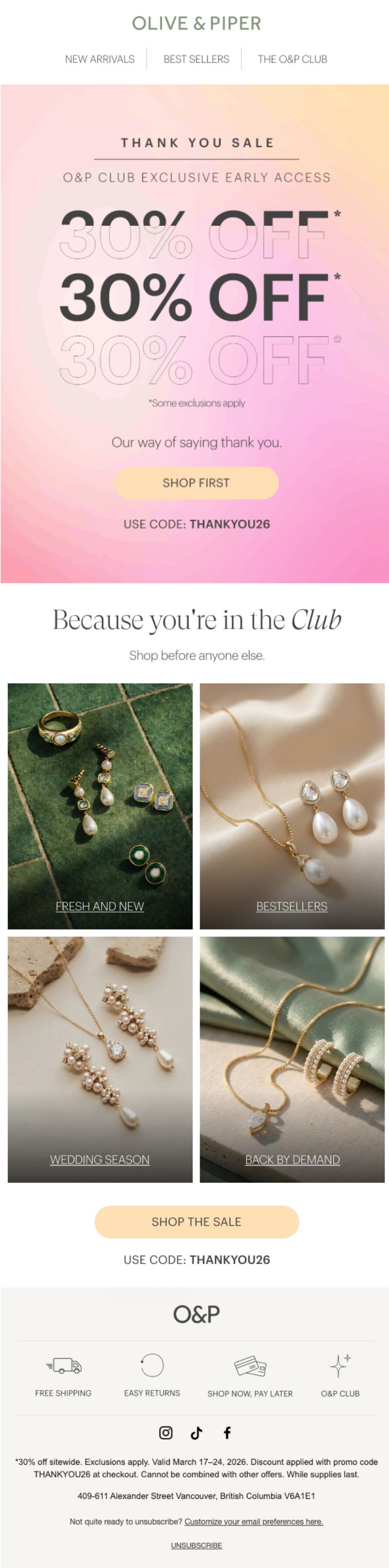 Olive & Piper sells accessible fine jewelry with a focus on everyday elegance and trend-forward designs. Their "Thank You Sale" positions 30% off as gratitude for O&P Club members (their loyalty program), creating exclusivity around what could be a standard sitewide discount.
